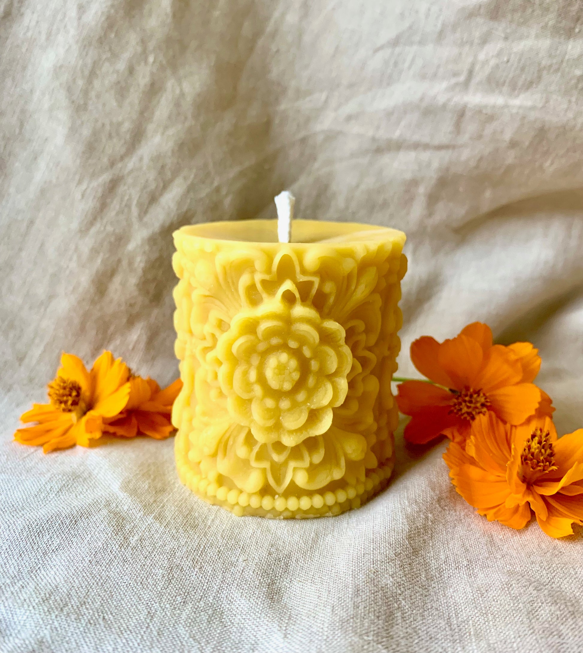 Beeswax Pillar Candle with Flower Mandala