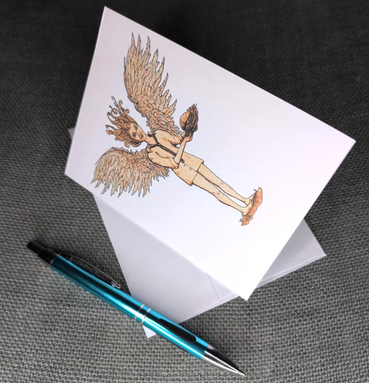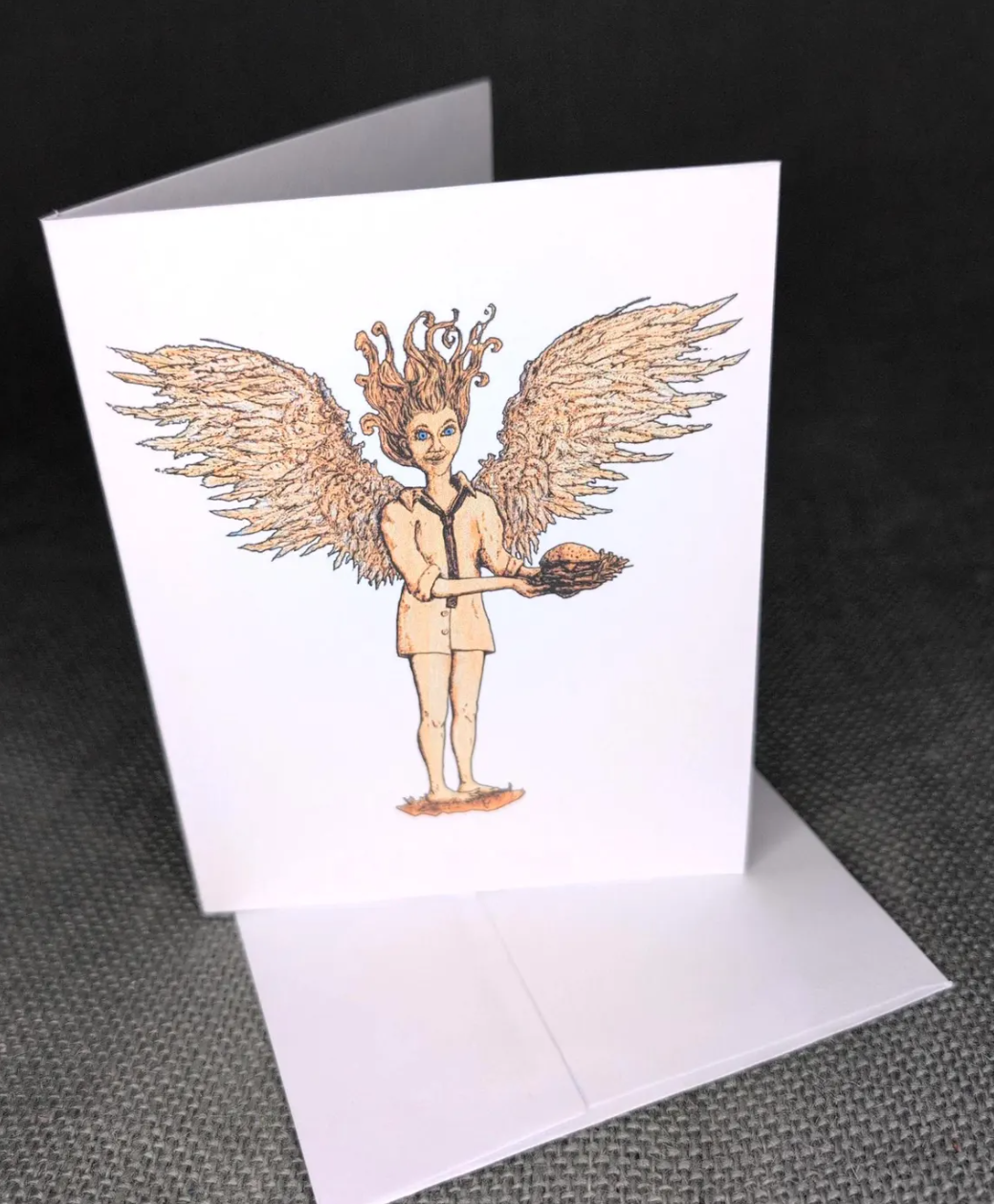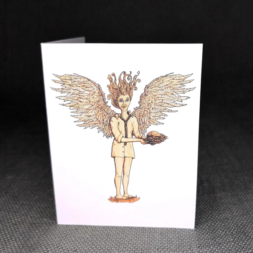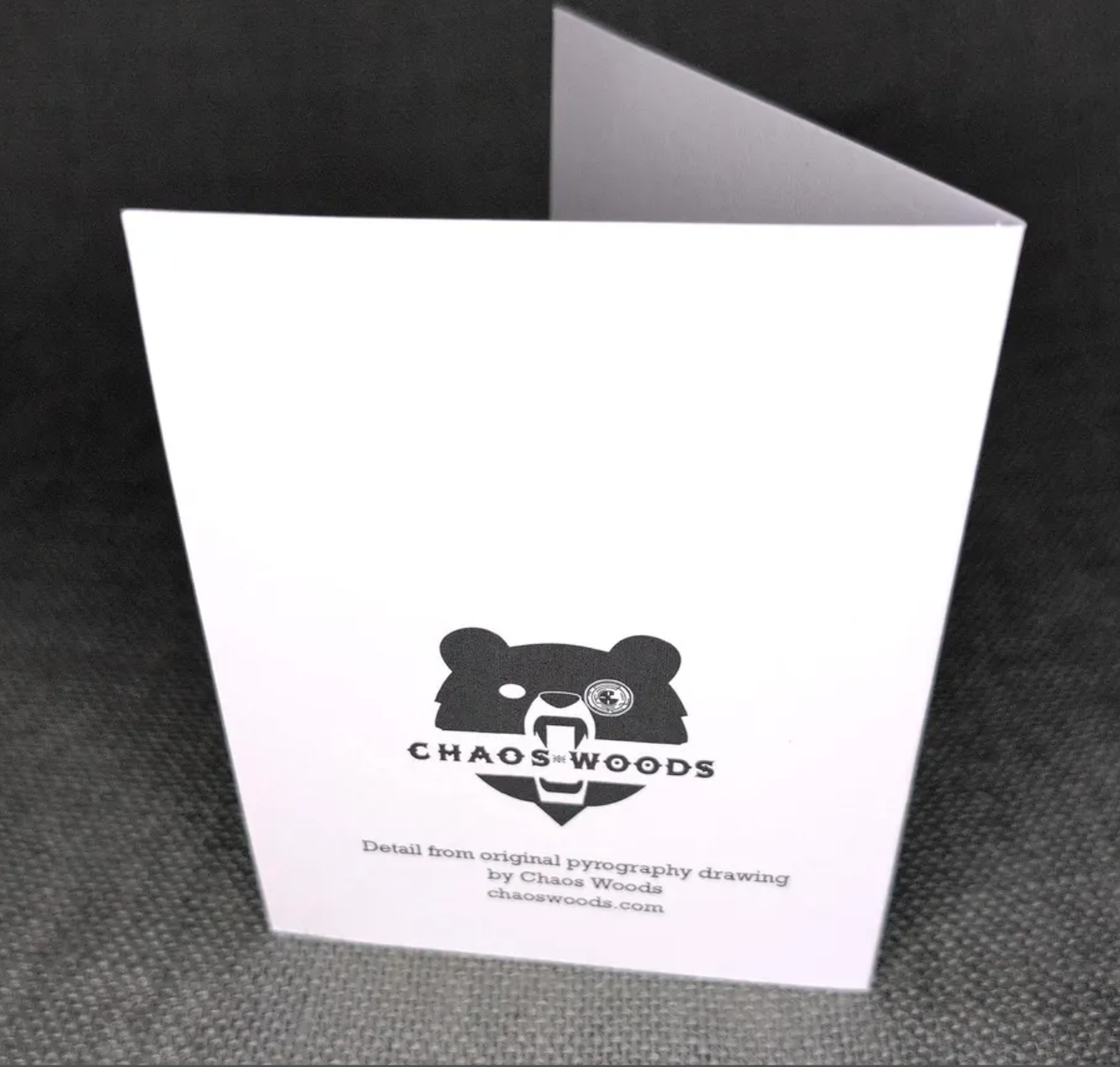 Detail from an original wood burnt, pyrography drawing created by Chaos Woods titled "Blaze Foley's Big Cheeseburger & Good French Fries" on a greeting card. Inspired by the the Texas singer songwriter, Blaze Foley.