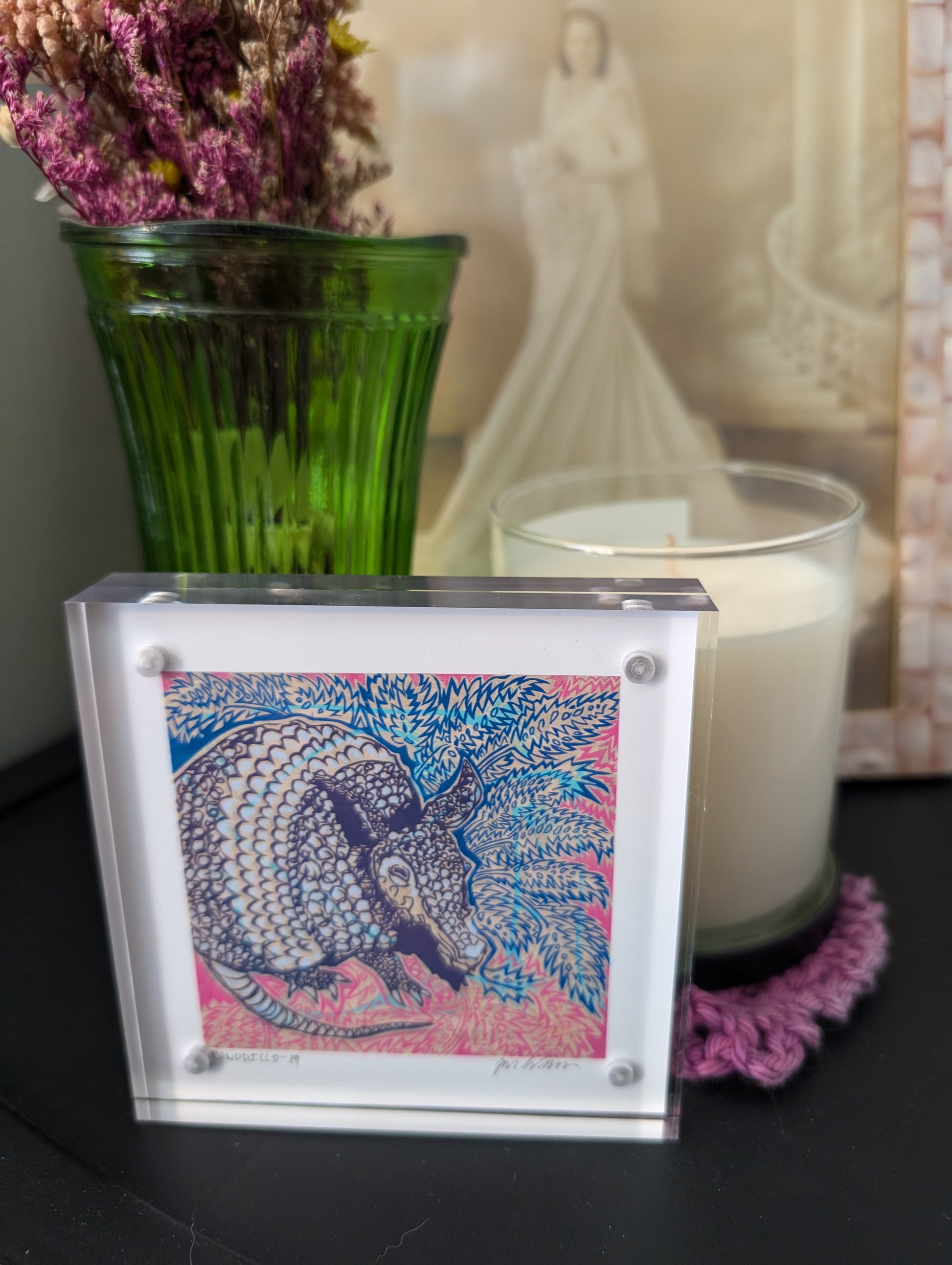 This 4X4 inch magnetic frame holds a BrunkyArt classic armadillo giclée print. A perfect gift for any Austin art lover!