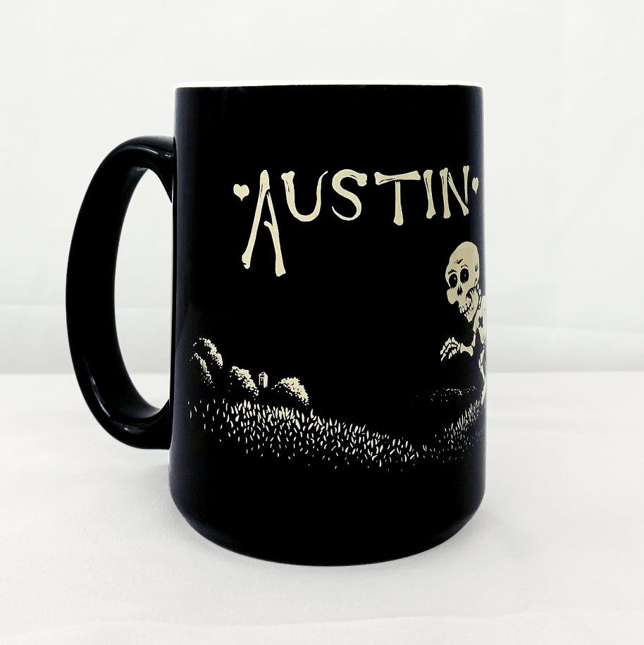 This black ceramic mug with blue interior features spooky skellies from the mind of artist Sam Hurt.