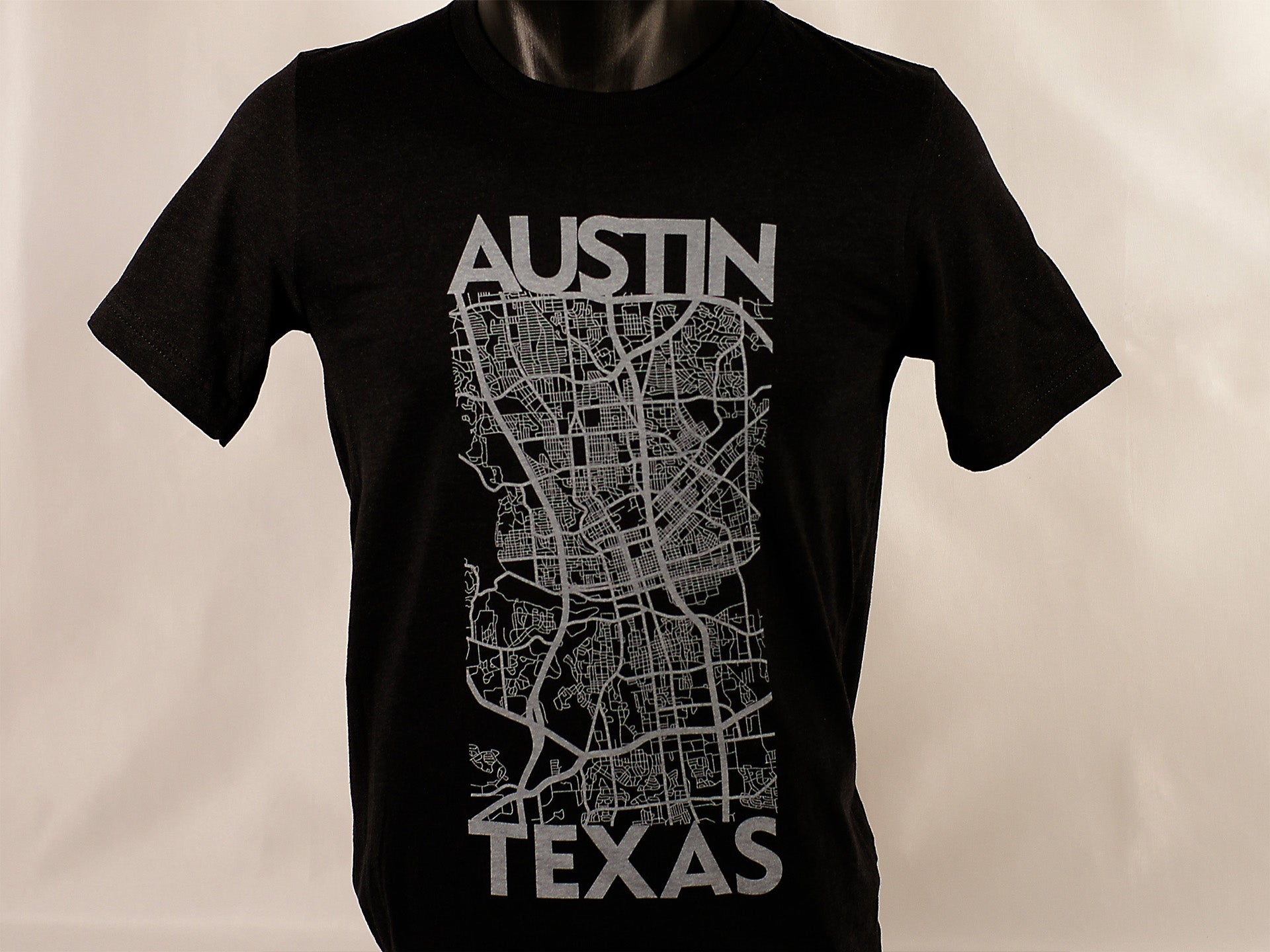 Hand screen-printed t-shirt featuring a map of Austin, Texas.