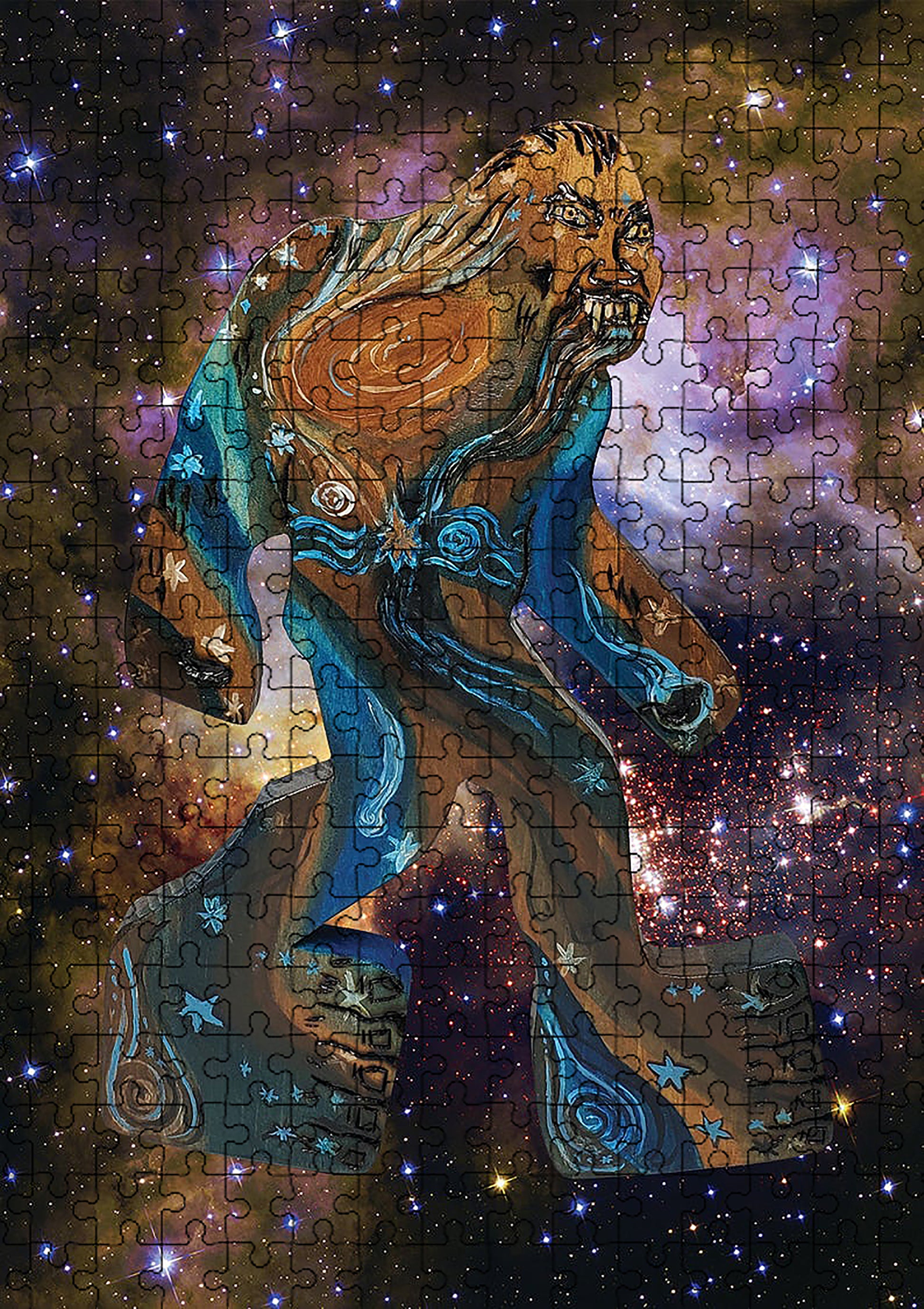 This is an excellent quality jigsaw puzzle designed using original art titled "Bigfoot the Universe" created by Chaos Woods. The original art is a Bigfoot shaped wood cut-out painted and wood burnt with stars and space dust. The puzzle is of the art piece superimposed over a photograph of the universe. The colors, swirls and repeated shapes make it a challenge! It's great for kids and adults who want to tackle a challenge that should take several, or more, super fun sessions. 285 piece puzzle. The completed puzzle measures is 16.5 inches x 12 inches. The box is 7in x 5 in x 1.5 in