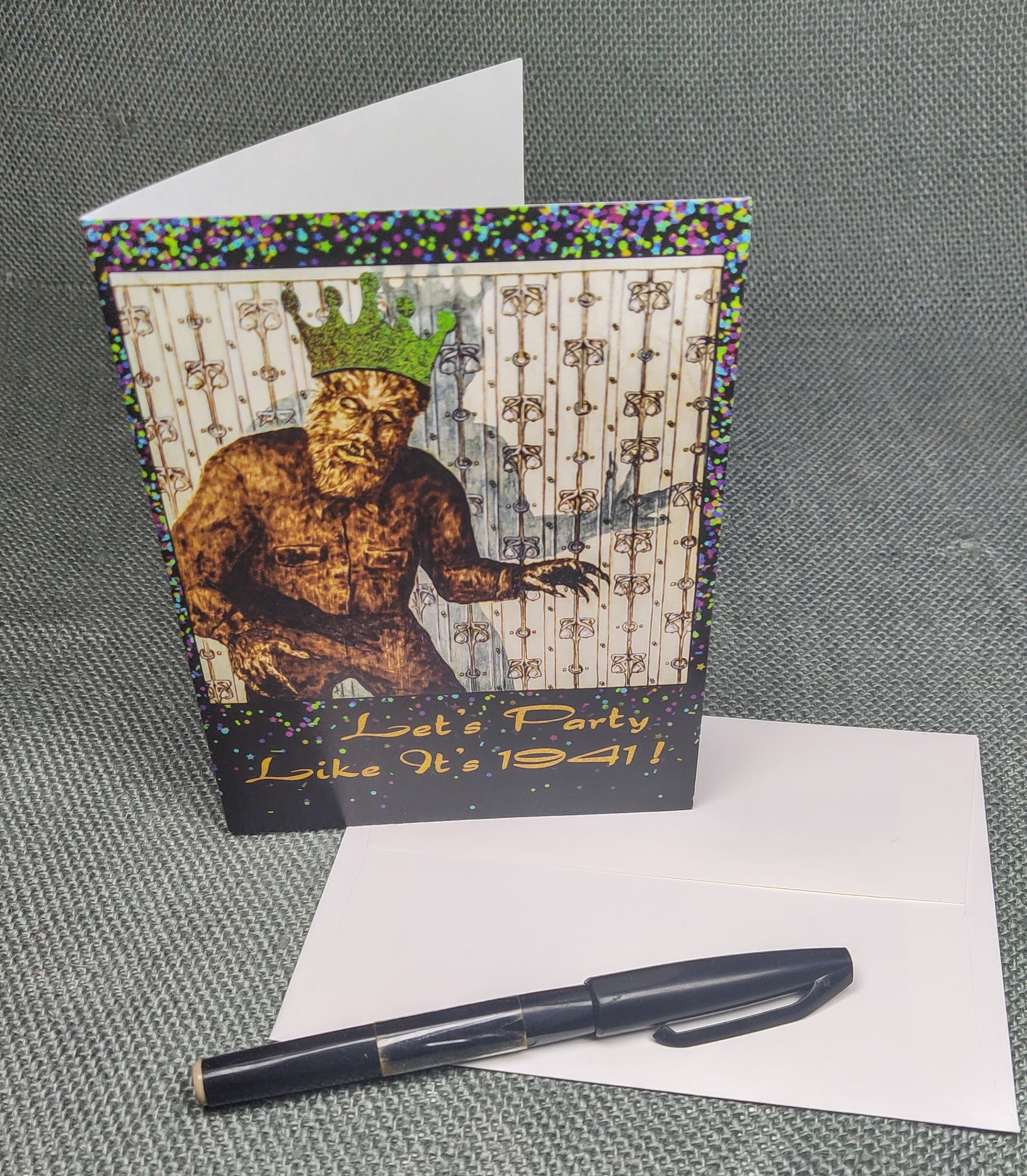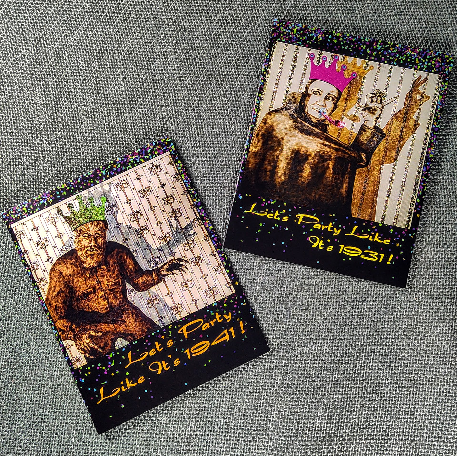 Celebrate any party occasion with these blank greeting cards with wood burnt drawings of The Wolf Man or Dracula and the words "Let's Party Like It's" and the year each movie was released.