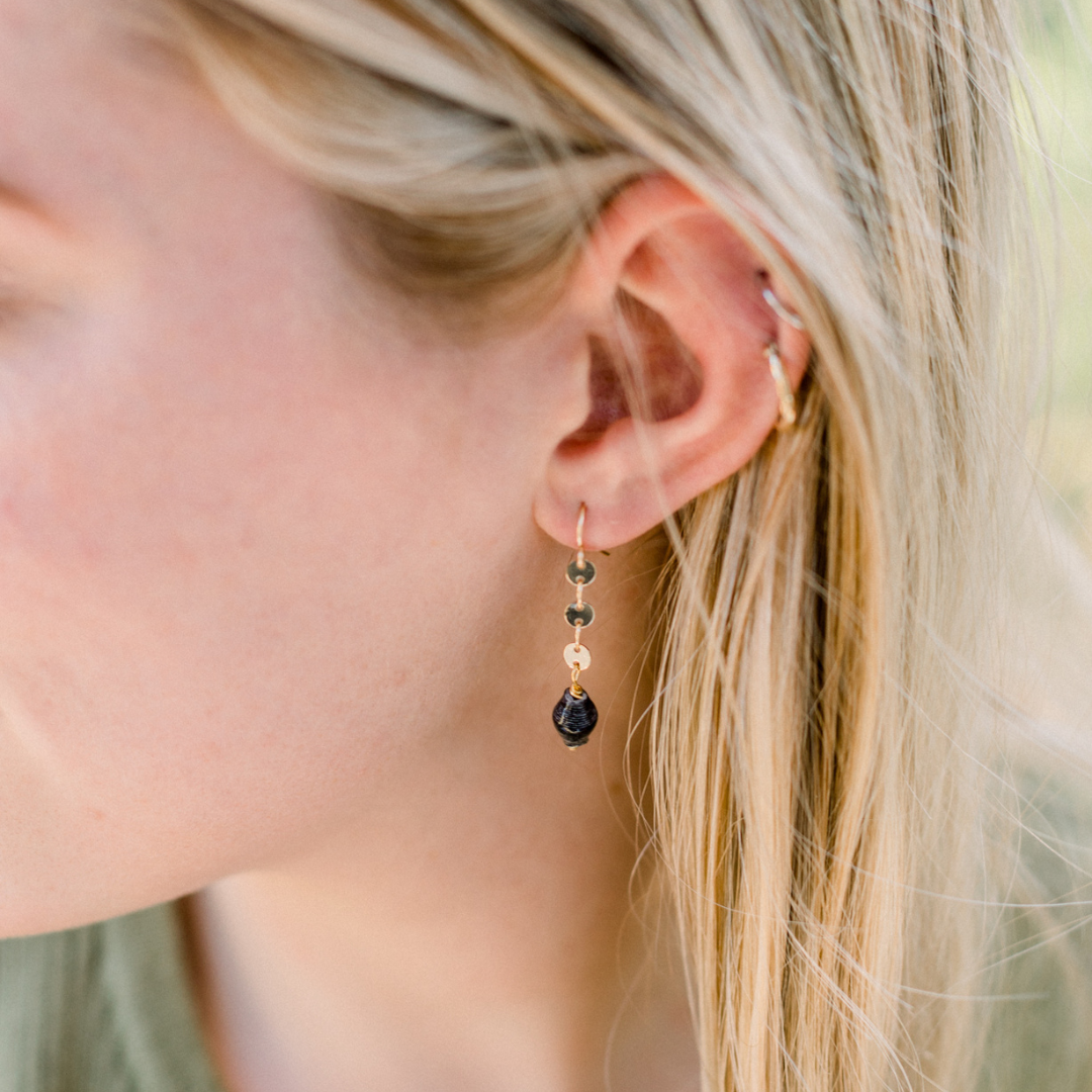 These dainty paper beads sit on gold-filled disc chain. They are everyday earrings that are feminine and lovely dressed up or down.