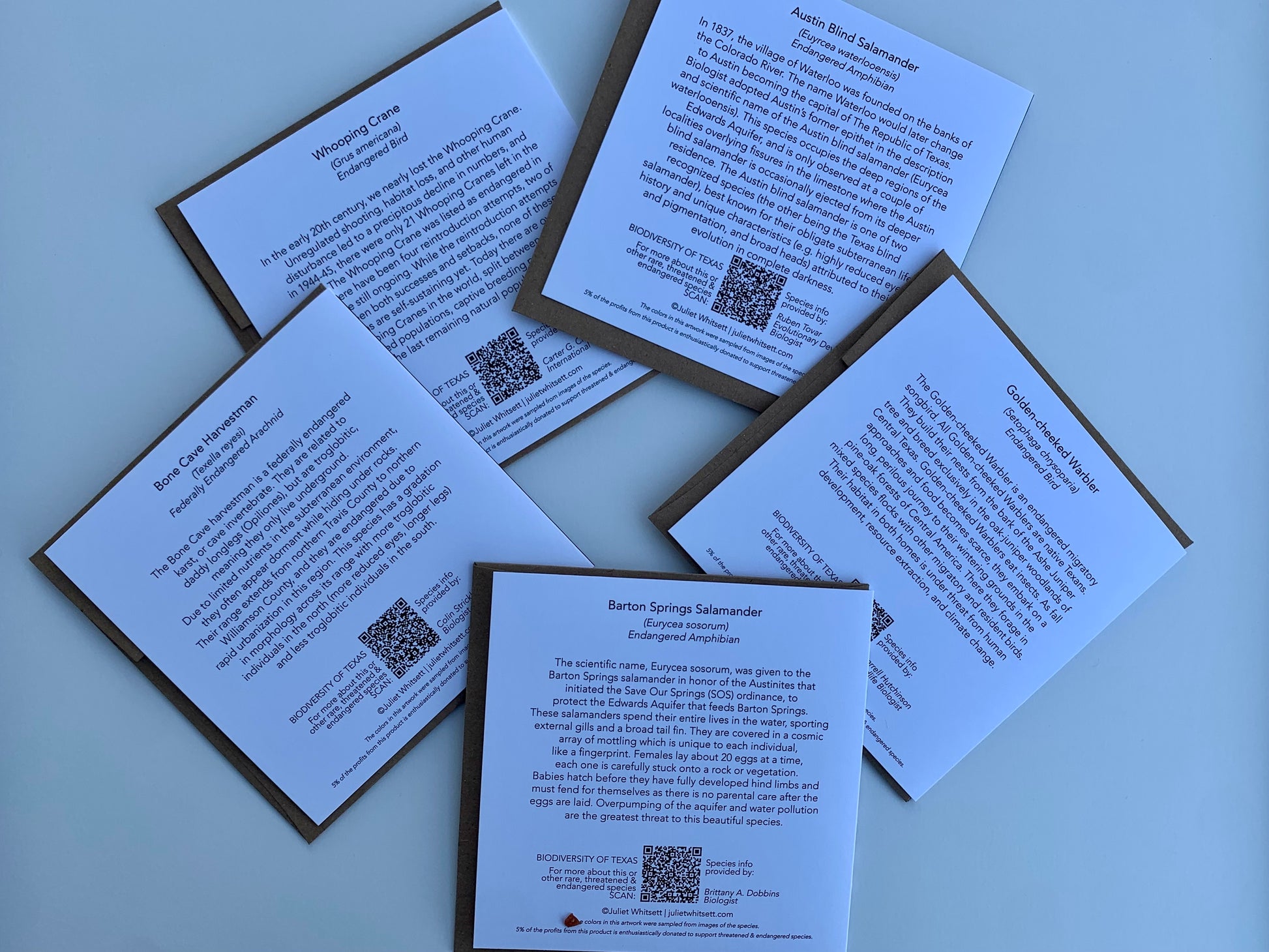 Greeting card pack includes 5 of the endangered species of Travis County. Includes Golden-cheeked Warbler, Texas Fatmucket, Austin Blind Salamander, Whooping Crane, Bee Creek Cave Harvestman. Expert information & deeper dive QR included on back! 5% of the profits from this product is donated to support Threatened & Endangered Species.