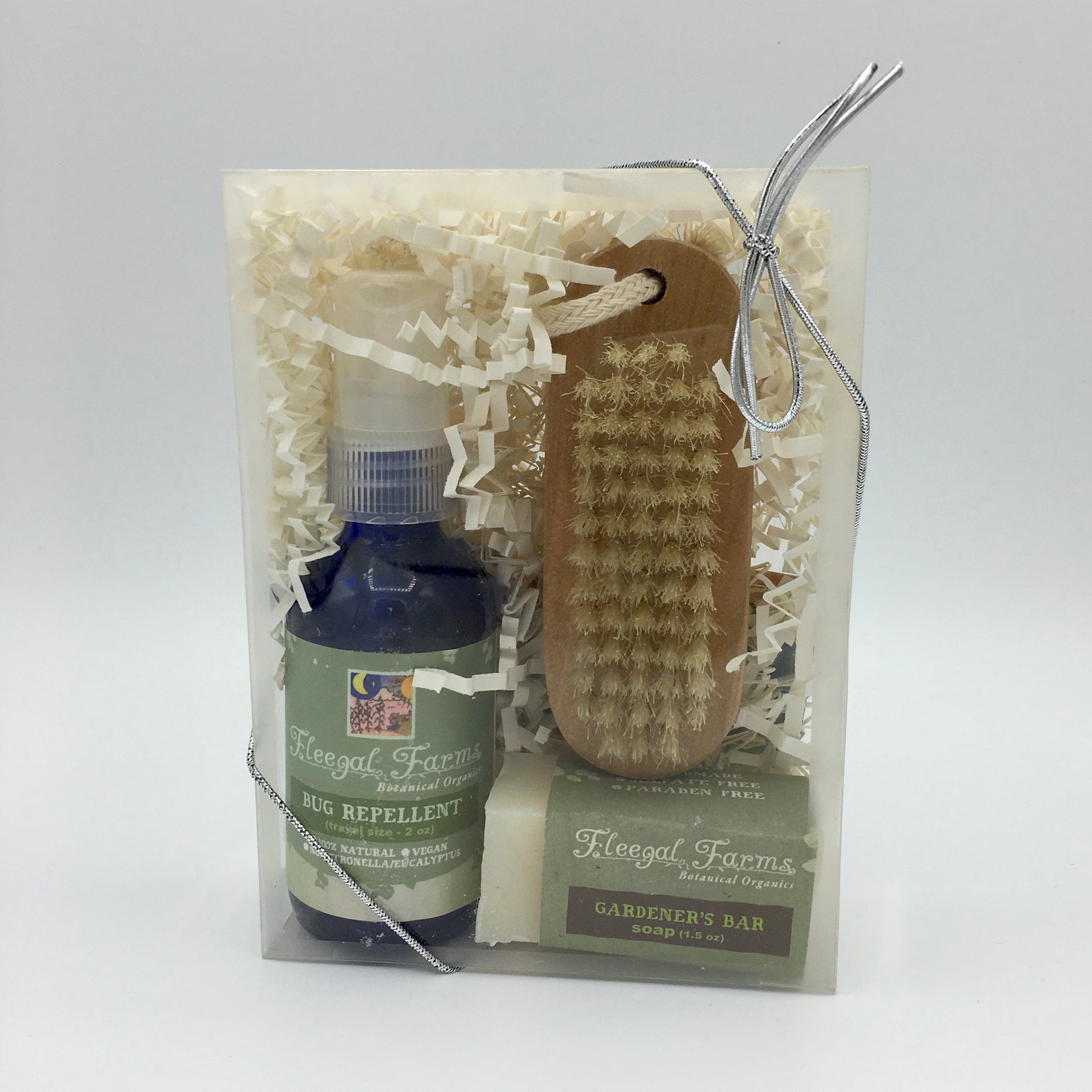 - The Gardener's set contains all-natural bug repellent, mini soap, and nail brush. The Gardener's bar soap is infused with rosemary, lavender, and spearmint oils, with added organic stone ground cornmeal to give your skin a great scrub.