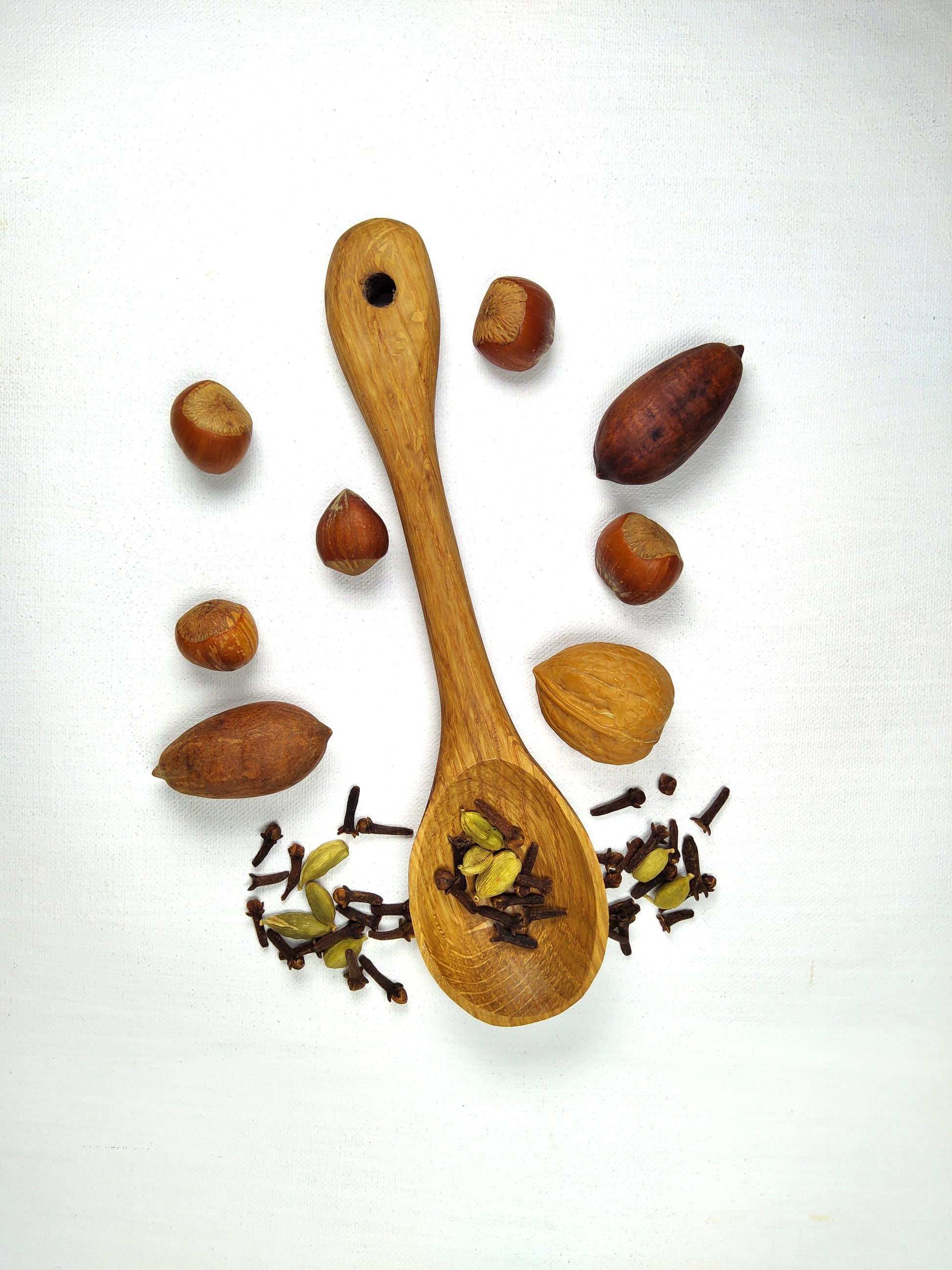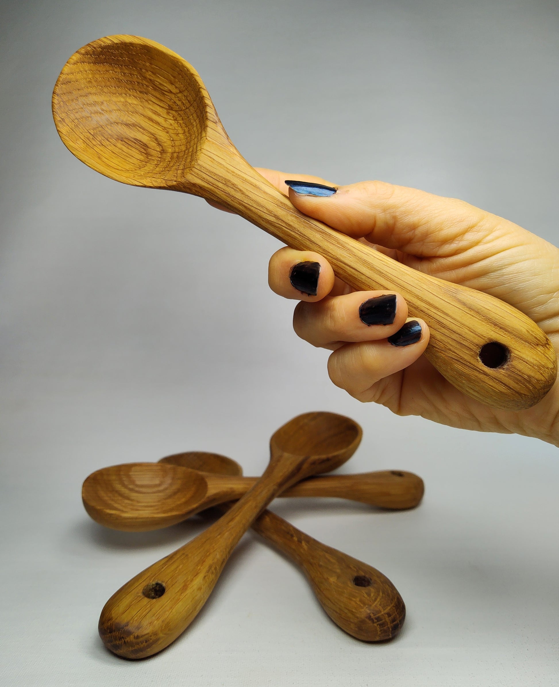 Handmade wooden spoon for cooking and natural kitchen decor. Each spoon is slightly unique; the woodgrain and shape vary. You will receive one of the pictured spoons.