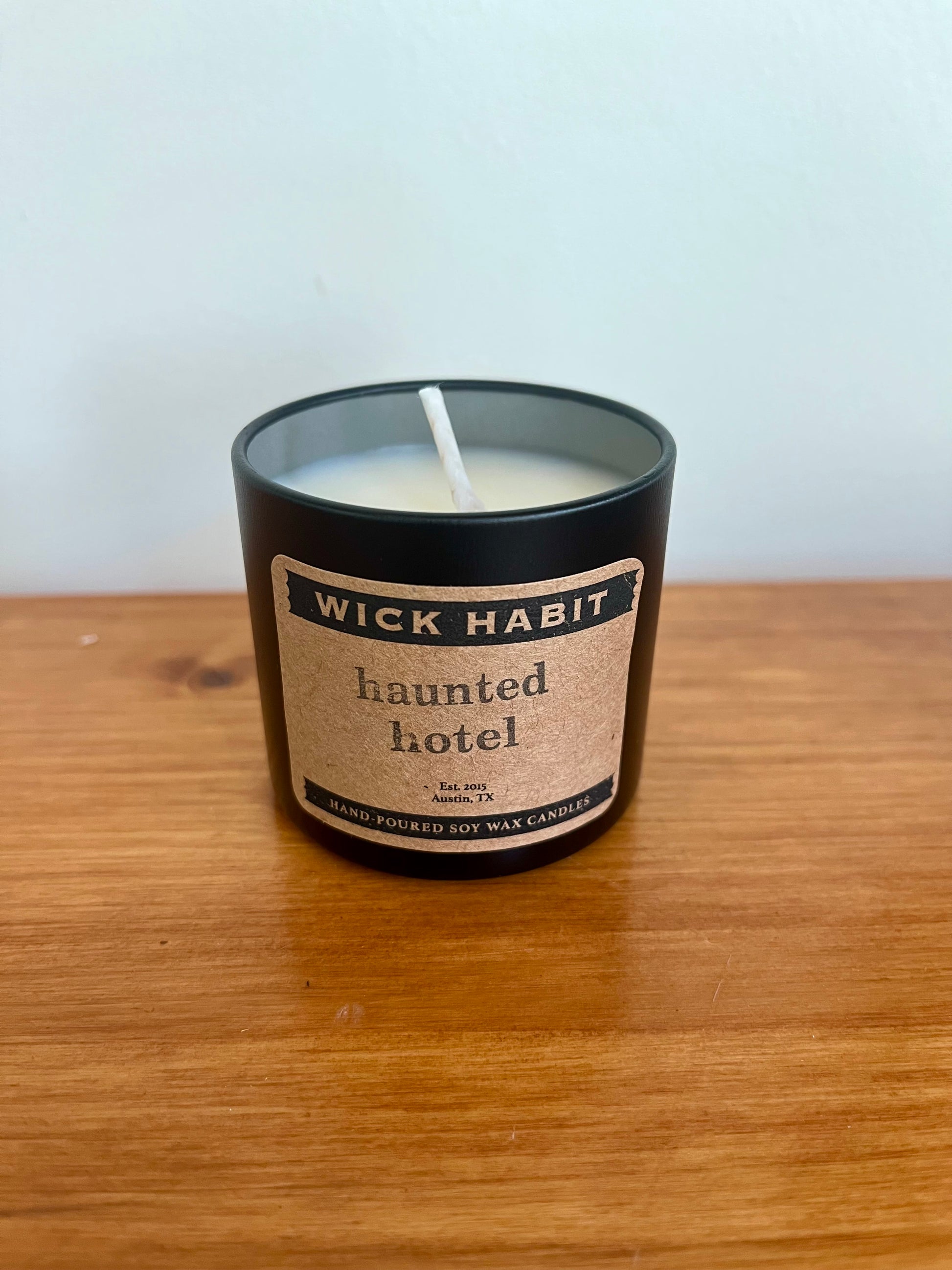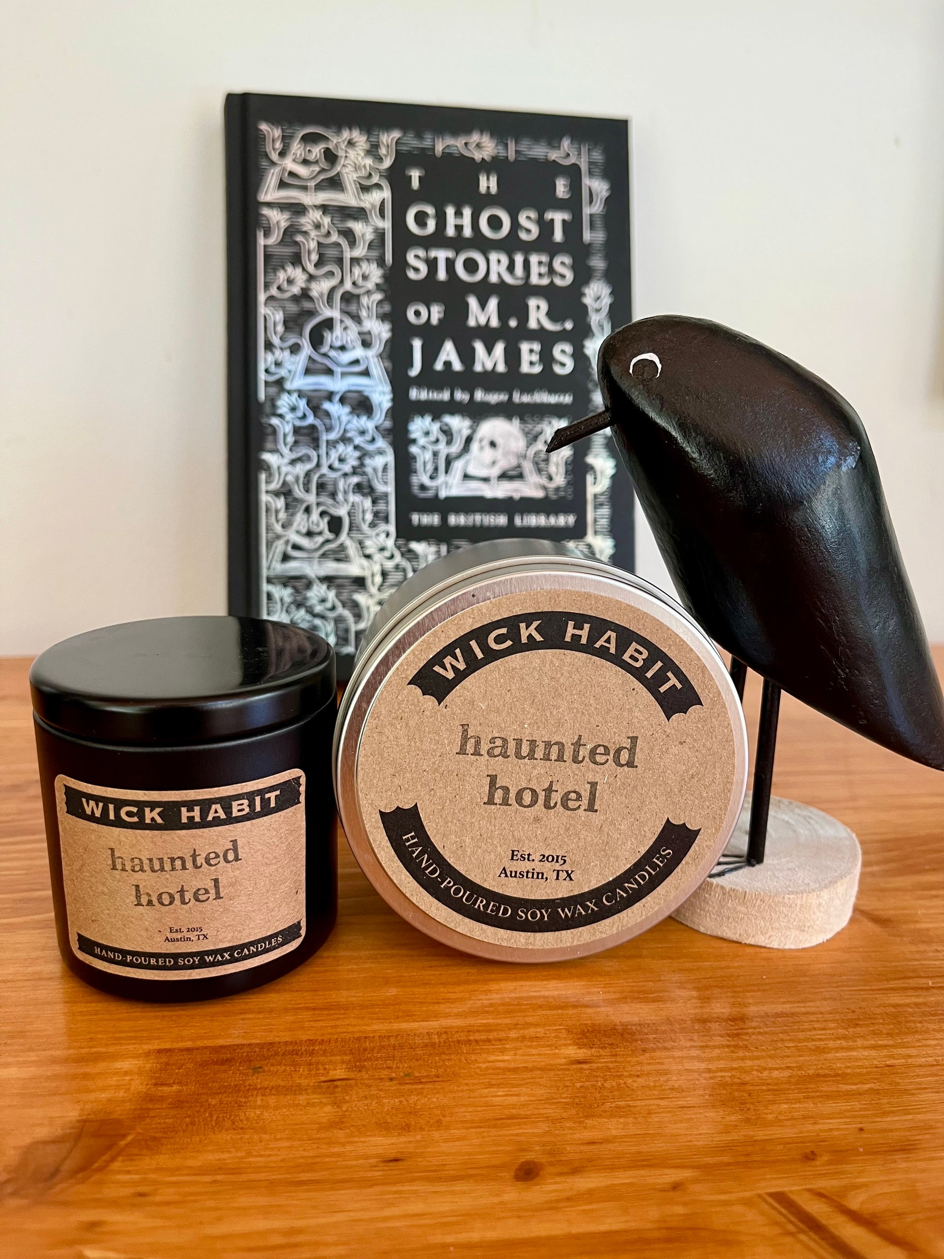 Soy wax candles in metal tins. A scent of history and ghostly glamour: polished wood, soft leather, and old-fashioned rose perfume.