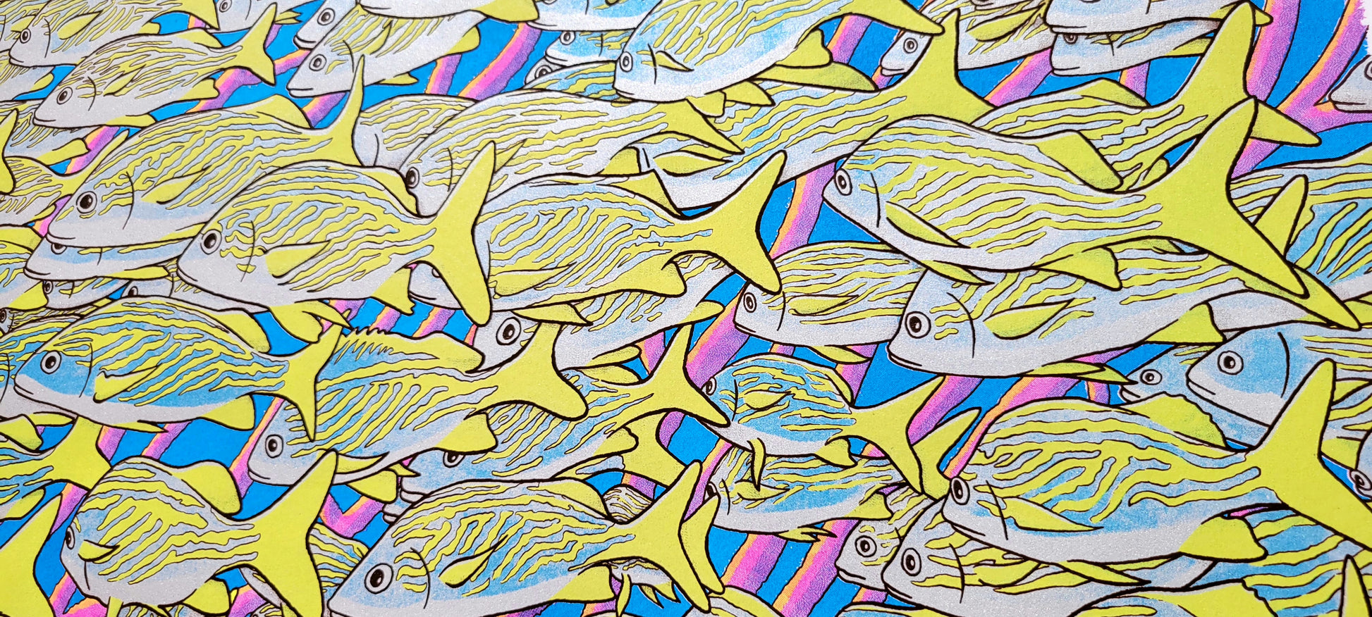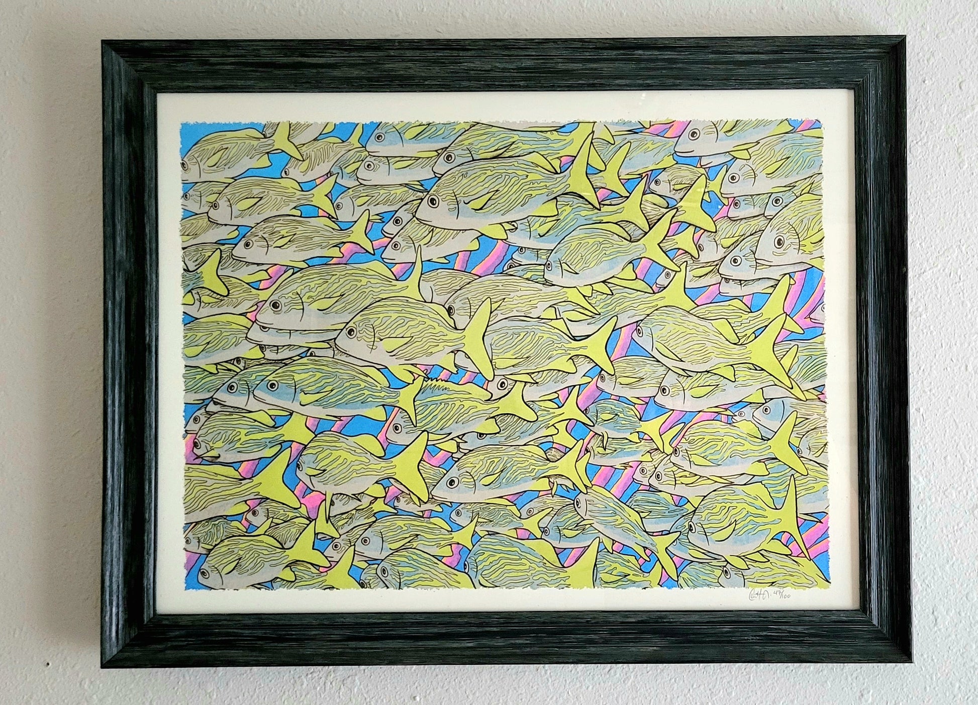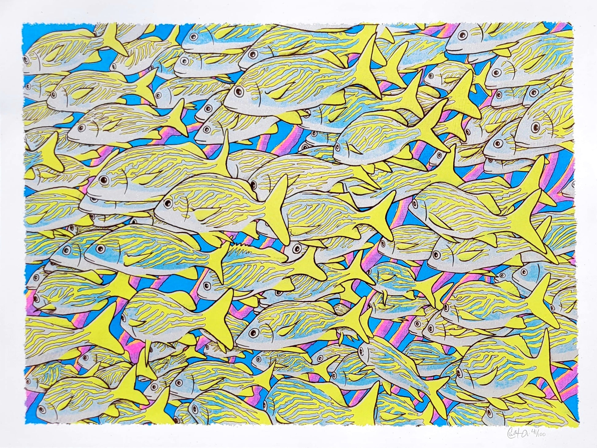 Inspired by travels to Mexico and SCUBA diving the Manchones reef off of Isla Mujeres. I encountered a large school of French Yellow Grunts and was mesmerized.