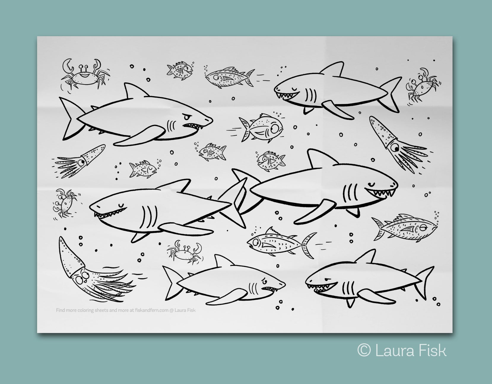SHARKS: Chomp Chomp! This oversized coloring sheet has Great White sharks, squids, and some very silly fish!