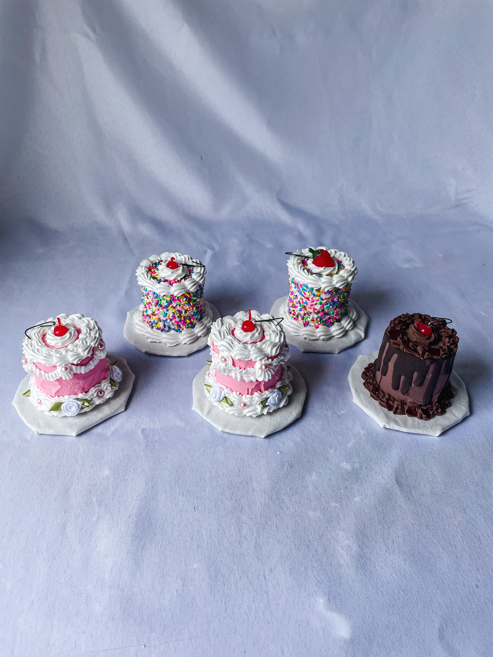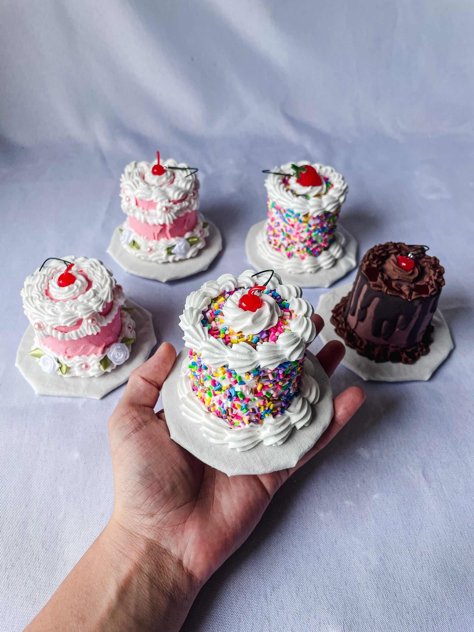 The mini fake cake ornament is a charming holiday decoration, available in three delightful designs: Chocolate, Rainbow Sprinkles, and Pink Vintage. Perfect for adding a whimsical, bakery inspired touch to your tree, each ornament captures the festive spirit in a playful, sweet form.