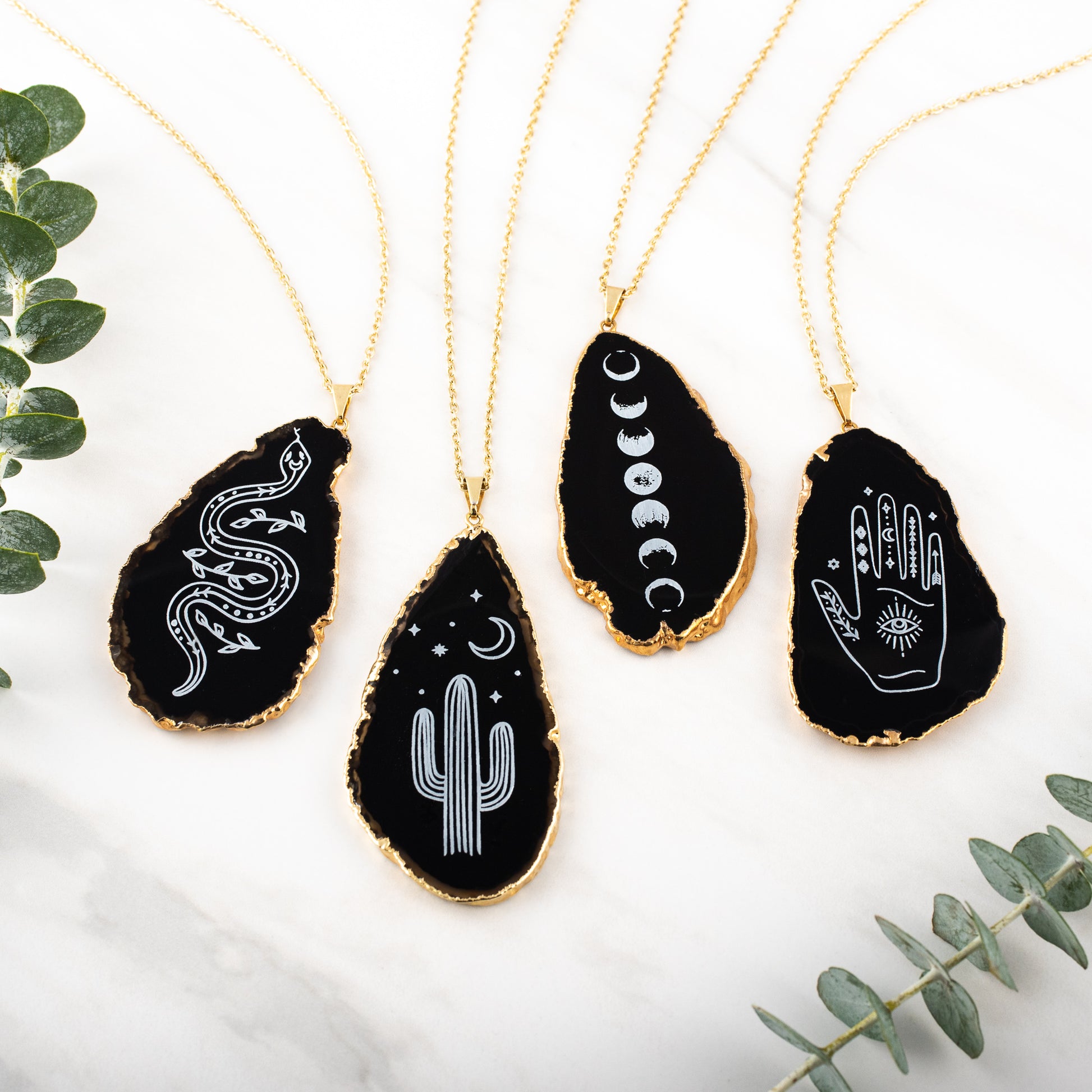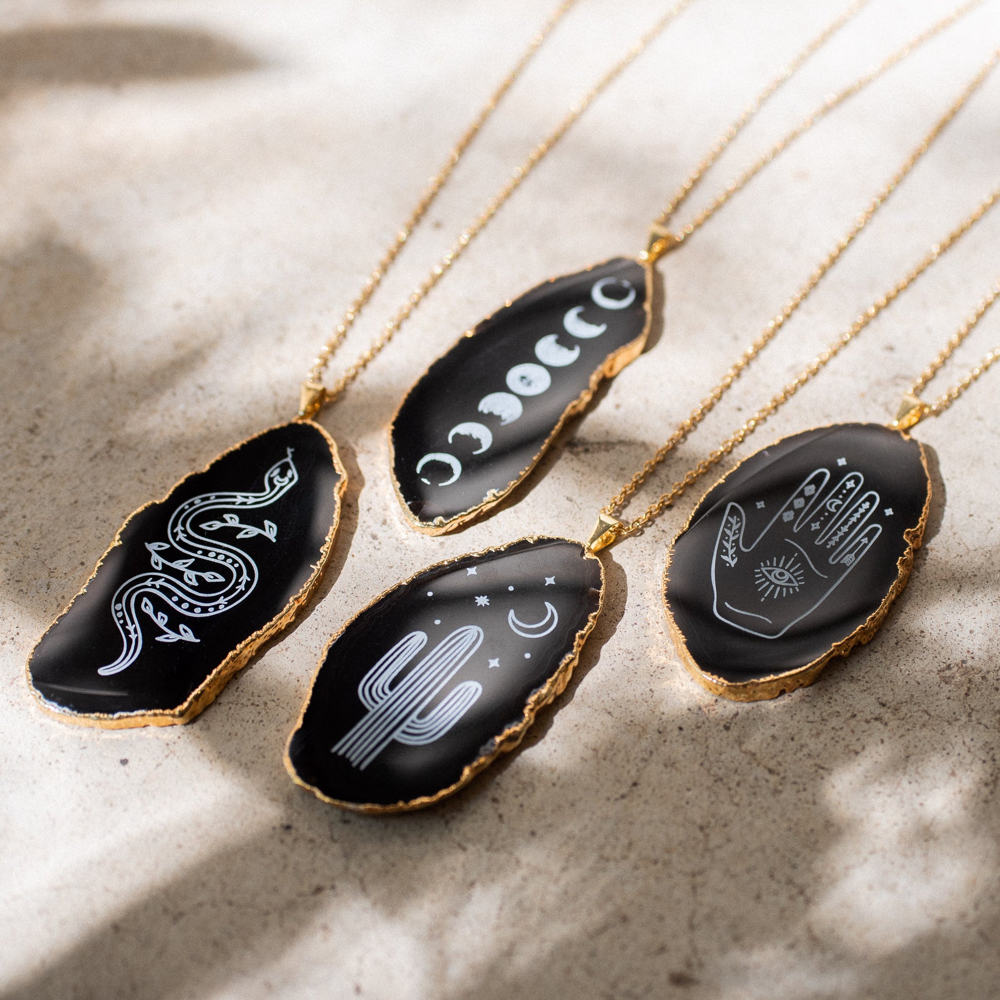 Our Mystic Stone necklace pairs the harmonizing properties of black agate with four etherial laser etched designs. Choose which drawing vibrates with you: the snake, the cactus, the moon phase or the hand.