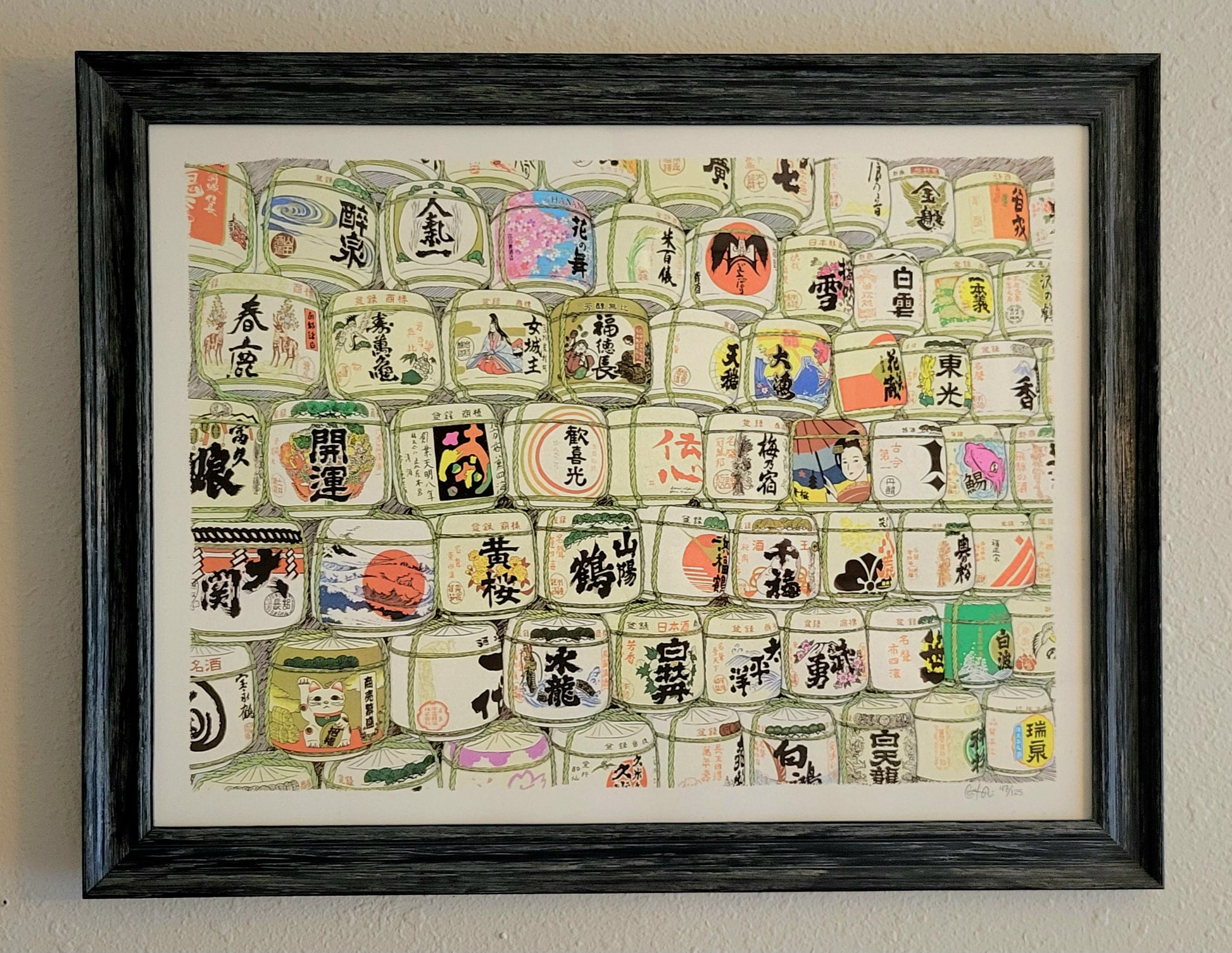 Inspired by the beautiful sake barrels found in Japan. 18x24, 4 color process screenprint. Each print is hand pulled and printed on 100 lb, Speckletone, French Paper, which has a wonderful pulpy, vintage texture.