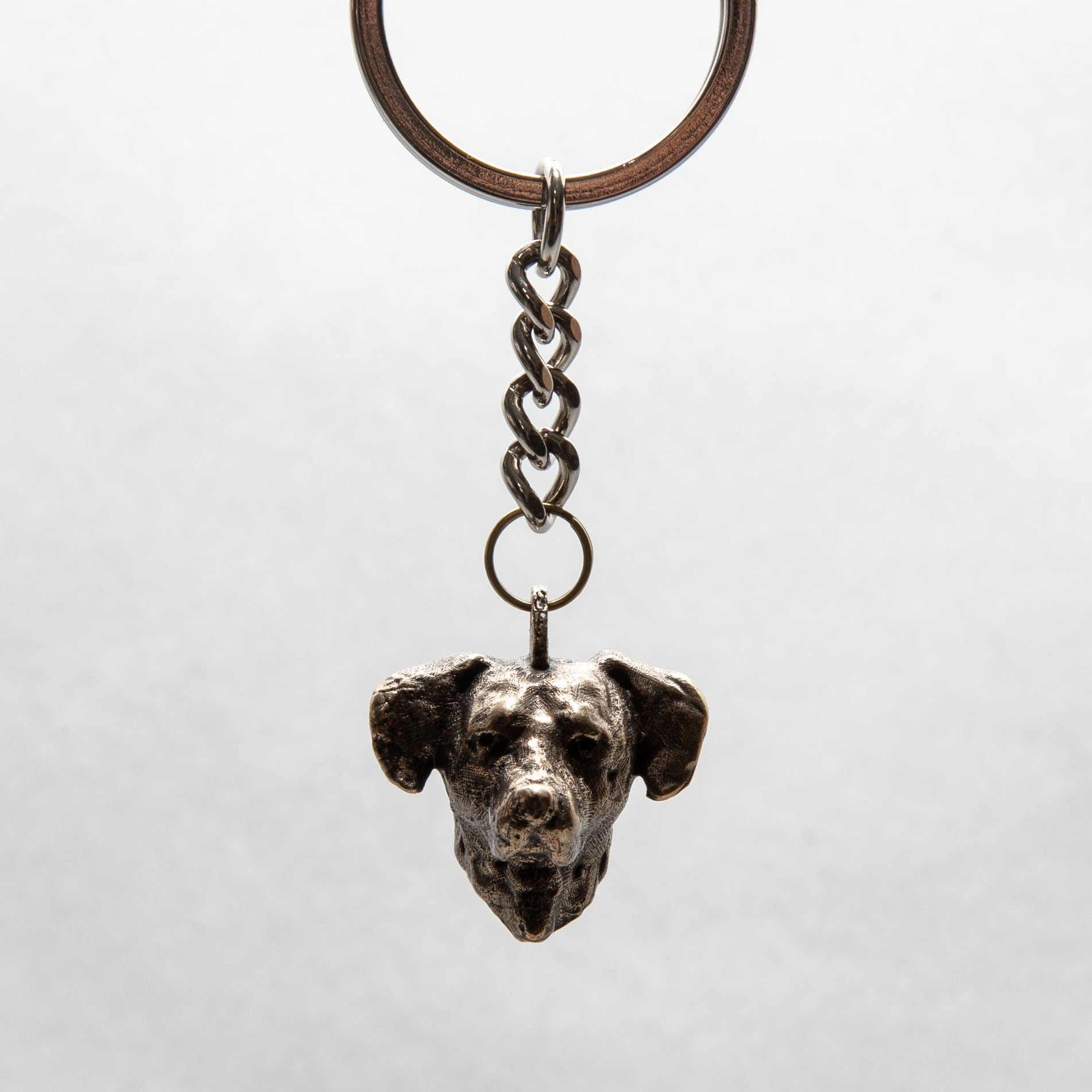 Hand cast bronze dog's head keychain. Dana Younger sculpted this adorably alert mutt (based on his own pet) and cast each one by hand in his home foundry. Add some art to your keyring with this unique pendant.