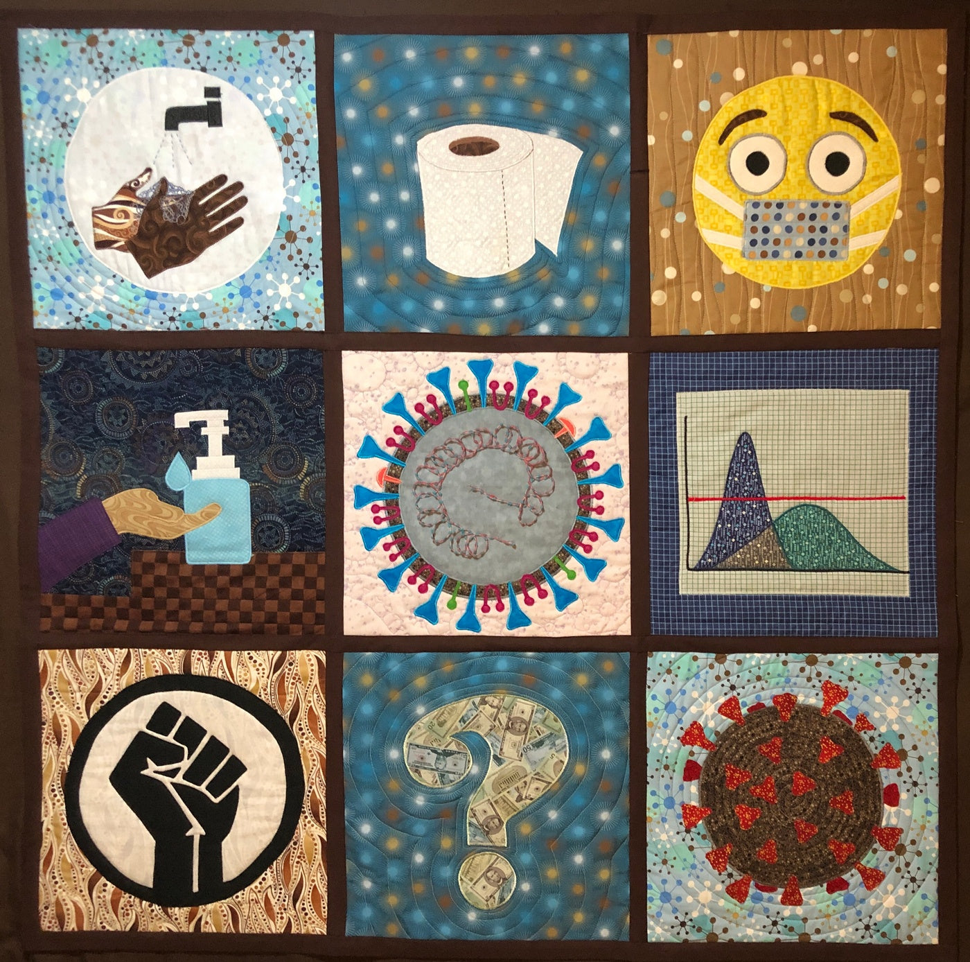 Puzzle made from an original quilted wall hanging that interprets some of the many icons and images we saw during the pandemic.