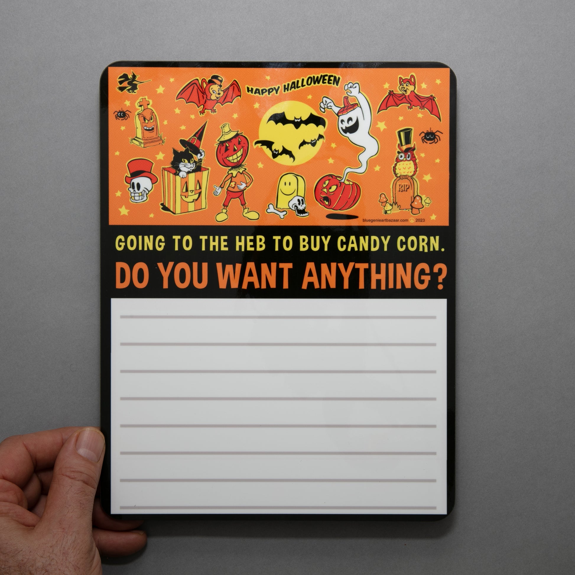 Keep track of the candy corn supply and other fall essentials with our dry-erase message board featuring retro kitschy Halloween characters designed by Rory Skagen.