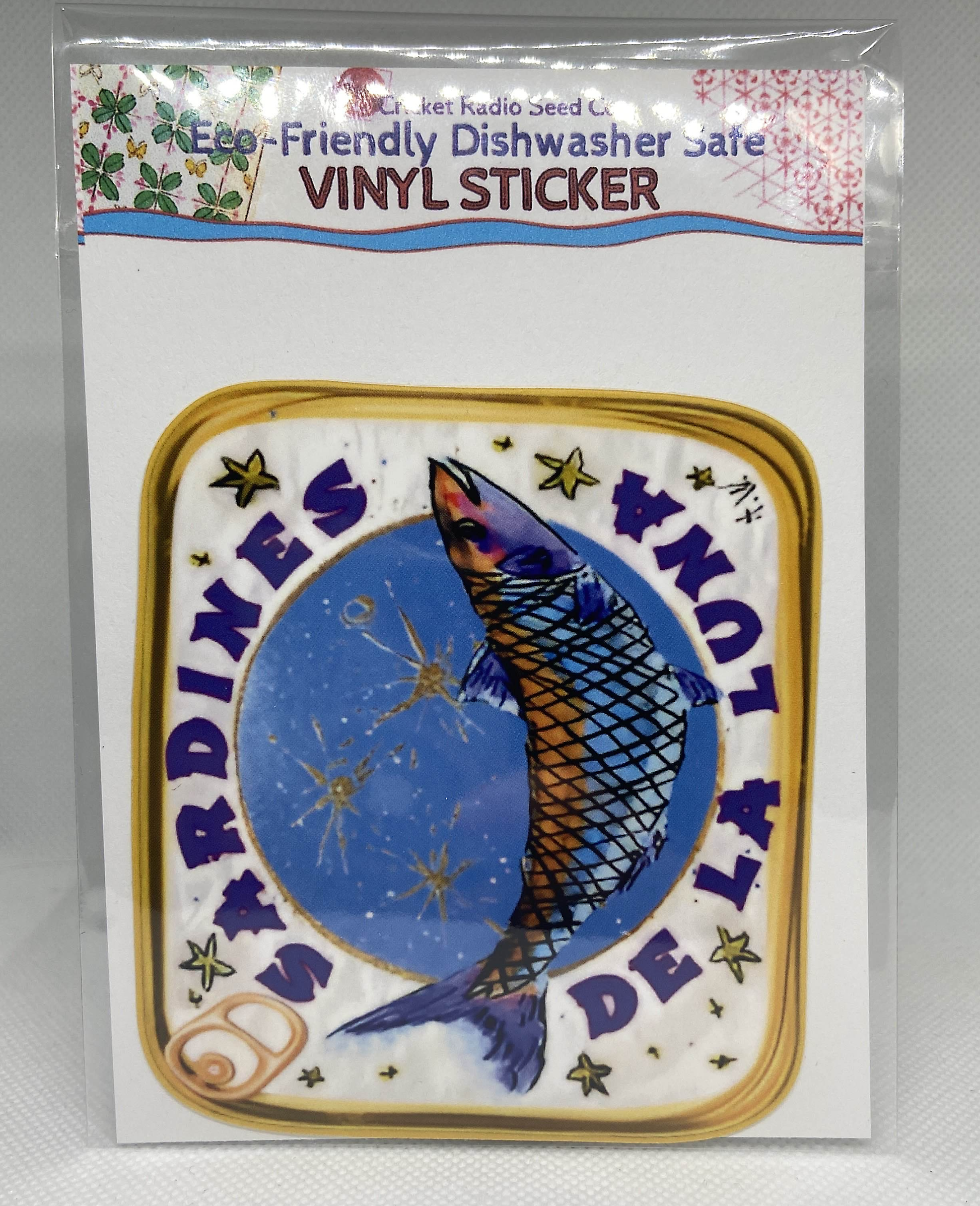 Our Sardine Tin Vinyl stickers feature our original watercolor fish with restored and recolored 19th Century Japanese watercolor art. The hand drawn artwork was created by the youngest member of our shop. Our stickers are Eco- Friendly, UV coated to last for years outside, and are tested safe in the dishwasher (just remember to let them fully adhere to a clean dry surface for at least 24 hours before they go into the dishwasher).
