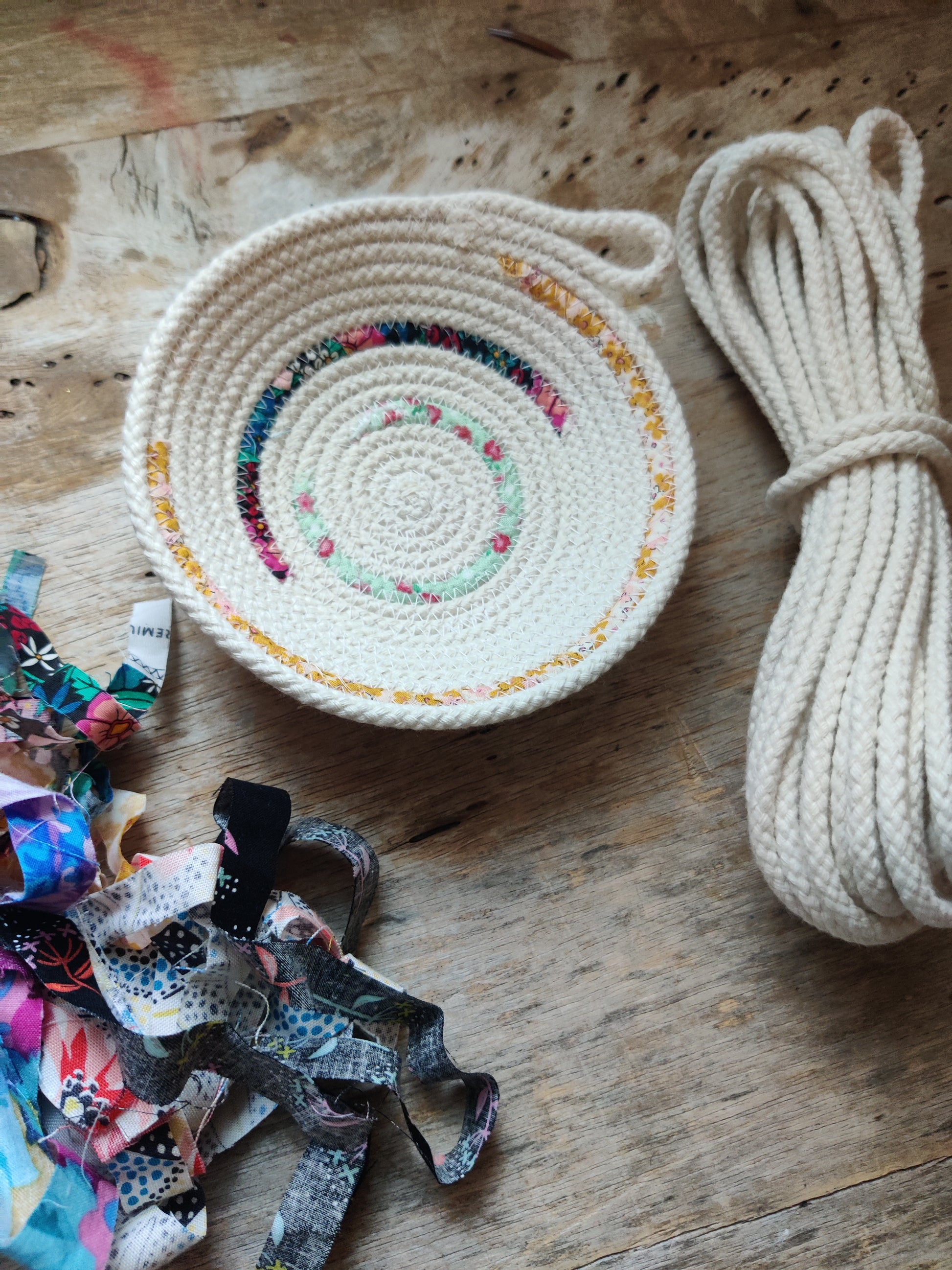 Make your very own rope bowl!!!Cotton rope bowls are the perfect addition to any room! This color block, fabric wrapped rope bowl is fun to make and a great way to learn a new sewing technique.