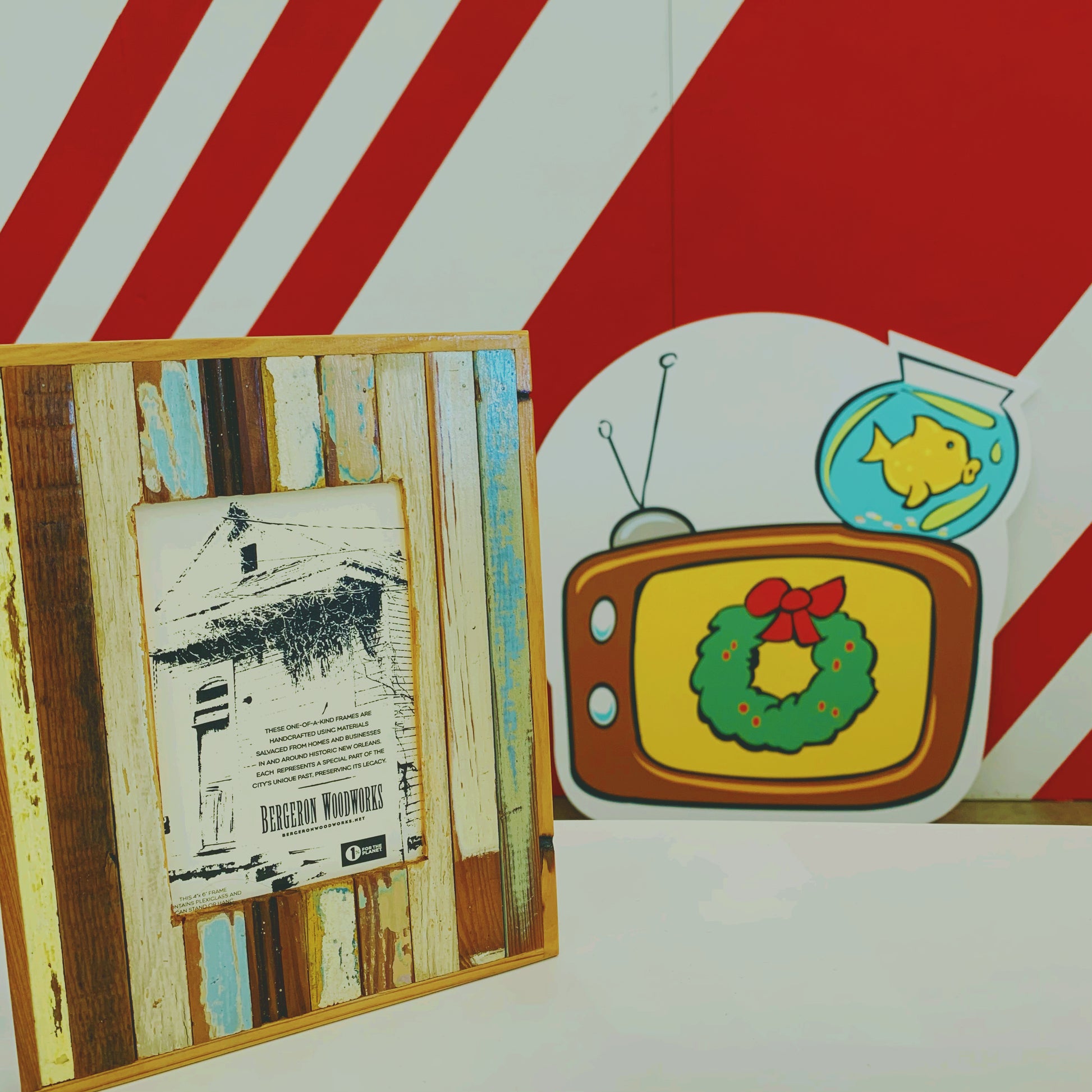 Picture frame for 4" x 6" photo created from reclaimed lumber salvaged in Louisiana. Includes glass and can be freestanding or hang on the wall. Colors will vary.
