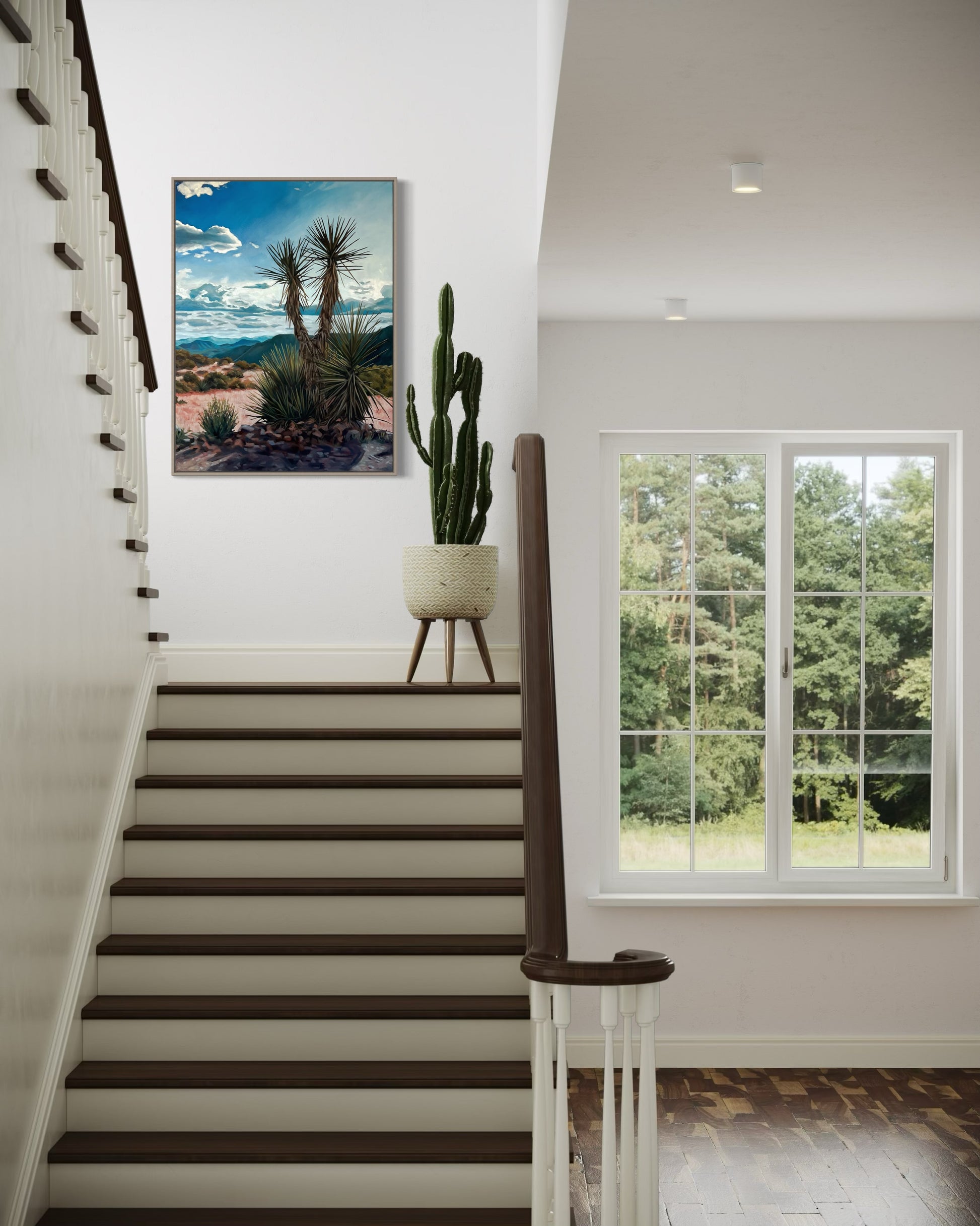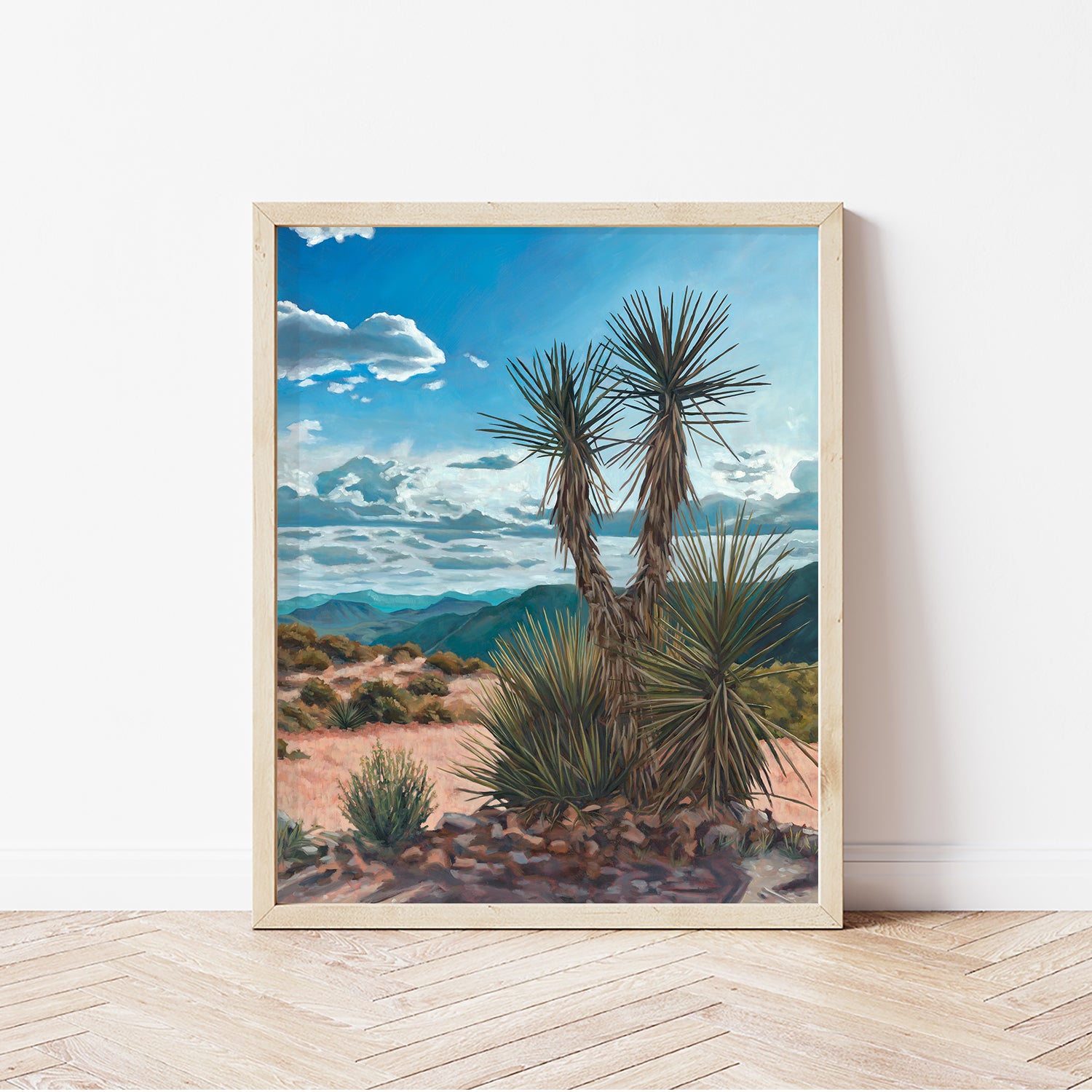 Enjoy this matted Giclee Print inspired by West Texas. Outside of Marfa, you'll find a public road through a private ranch with views of Pinto Canyon Ranch. Every mile and minute of driving down that old gravel road is worth the views of Yucca like these.