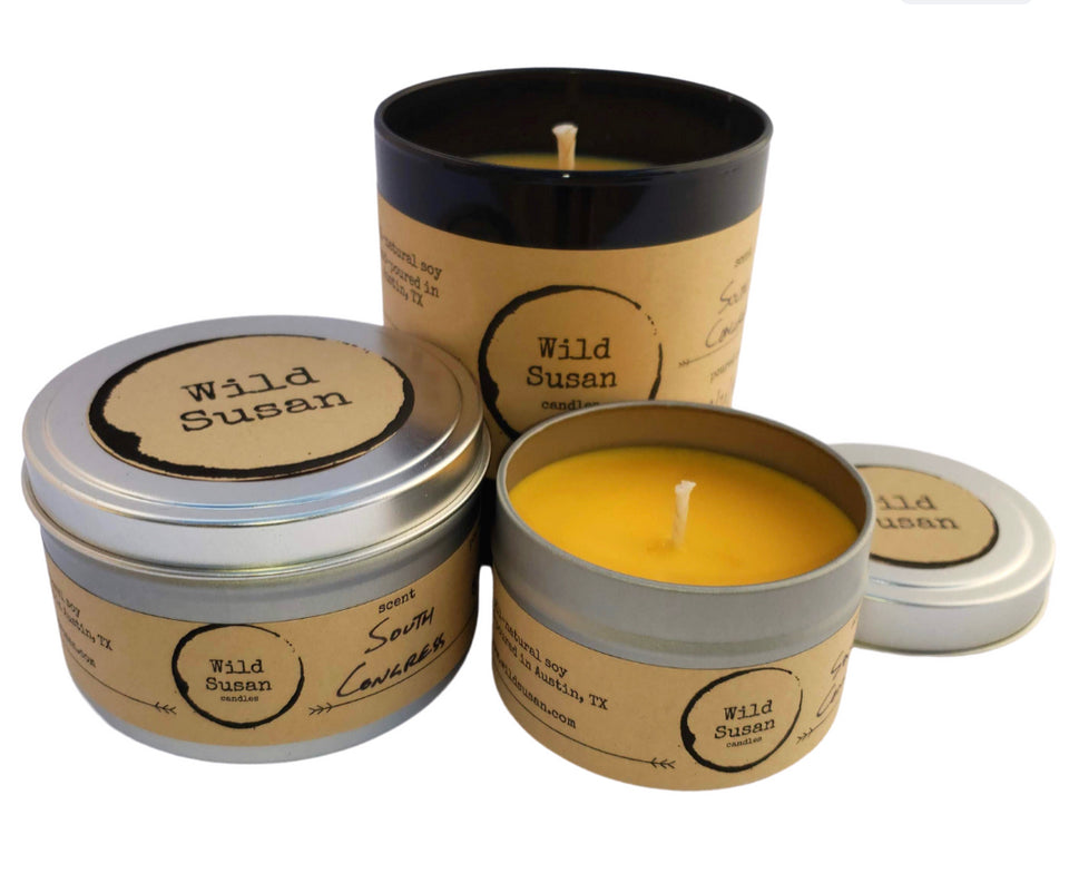 The South Congress candle features citrusy bergamot with darkly sweet notes of amber and just a touch of patchouli...it wouldn't be the SoCo candle without that!