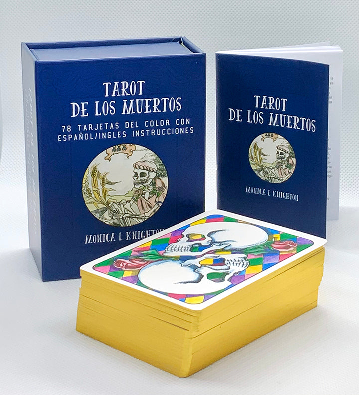 Inspired by the Dia de los Muertos holiday, the Tarot of the Dead is a full color 78 card tarot deck featuring playful skeleton imagery. The poker size cards have gold gilt edges and come in a hard board magnet enclosure box with a 36 page Spanish and English instruction booklet.