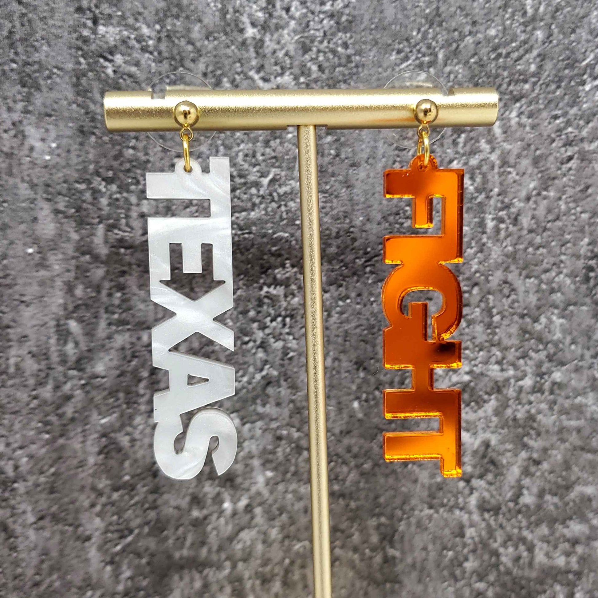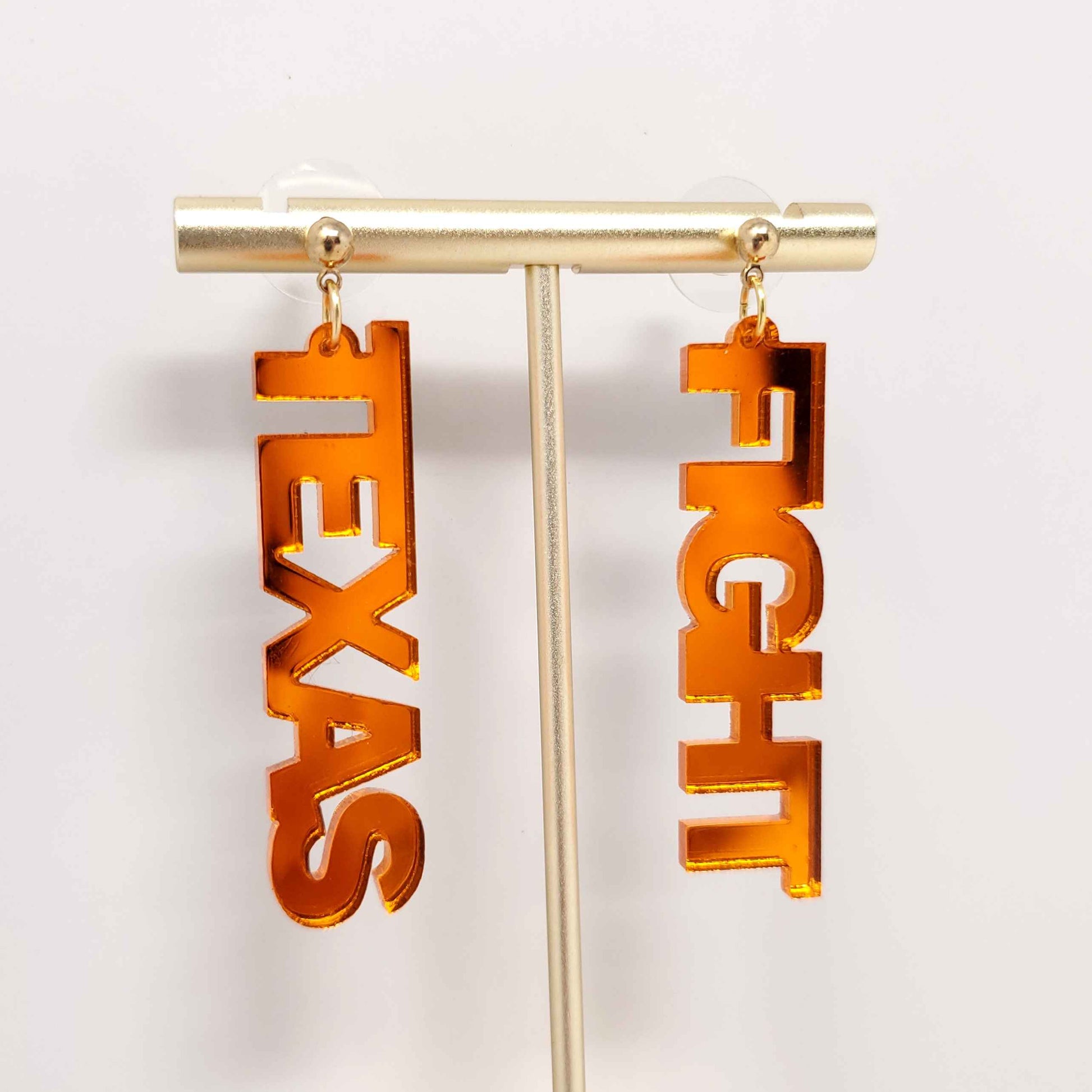 Cheer on your favorite team, the Texas Longhorns, with these stylish game day earrings! The laser-cut orange and white "TEXAS FIGHT" is complemented by mirrored acrylic and 18kt gold-plated hardware for a unique and eye-catching look. 2" long, 1/2" wide