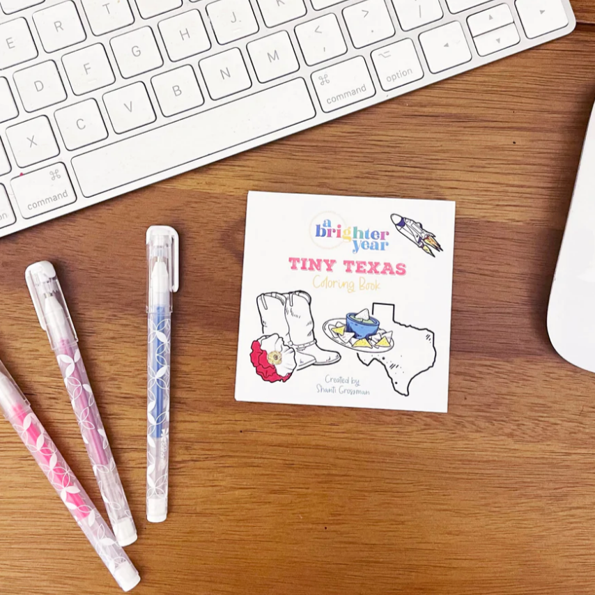 Get your daily dose of color with this Tiny Texas coloring book from A Brighter Year. Color your world - one moment at a time with this small 3 inch x 3 inch coloring book. Each adorably designed coloring page takes just a few moment to color, leaving you relaxed, refreshed and rejuvenated. From wildflowers to wildlife, skylines to scrumptious Texas treats, there is something for everyone in this Tiny Texas coloring book. It is perfect for adults looking to get their daily dose of zen, or children looking for a few moments of creative fun!