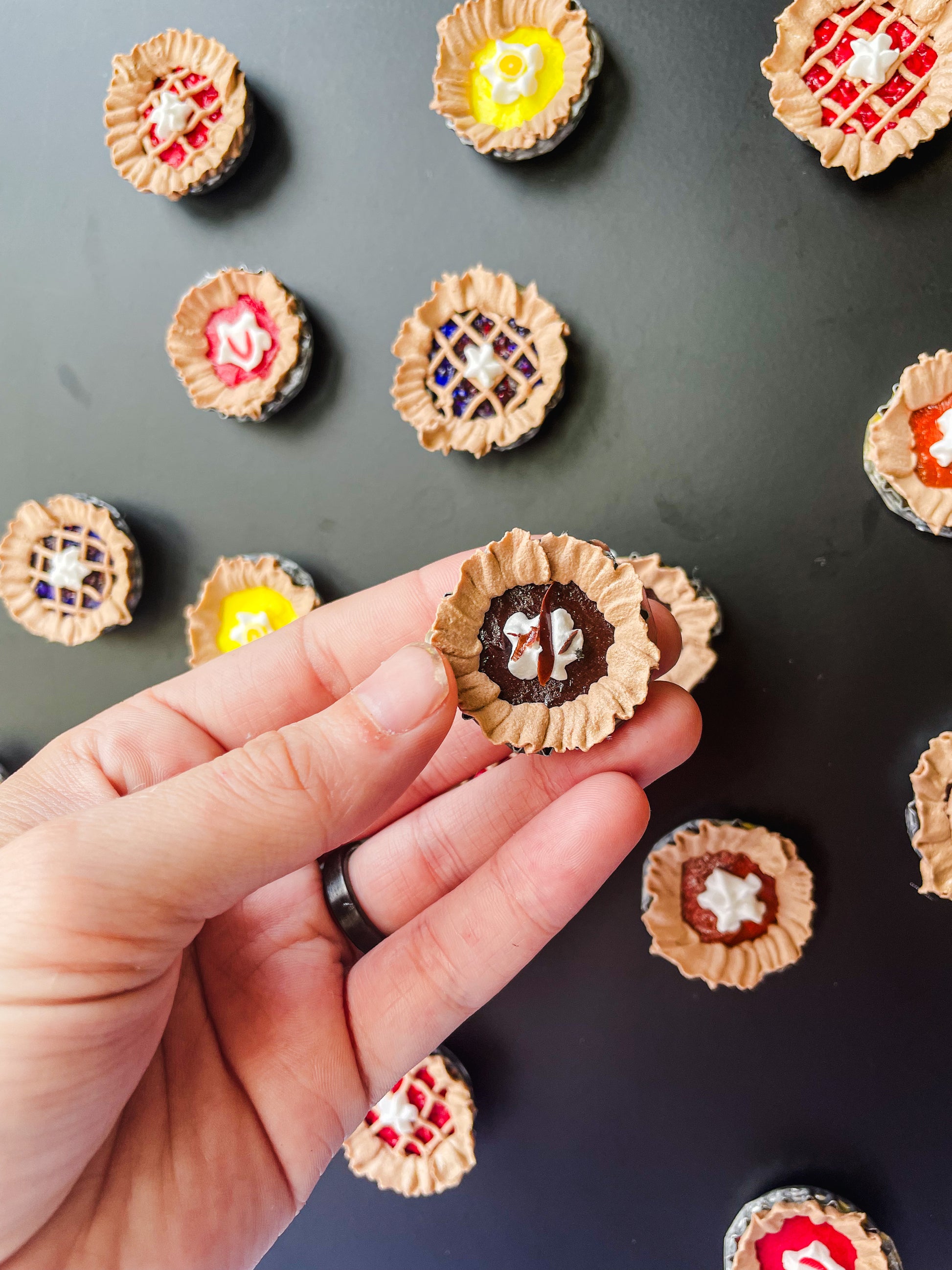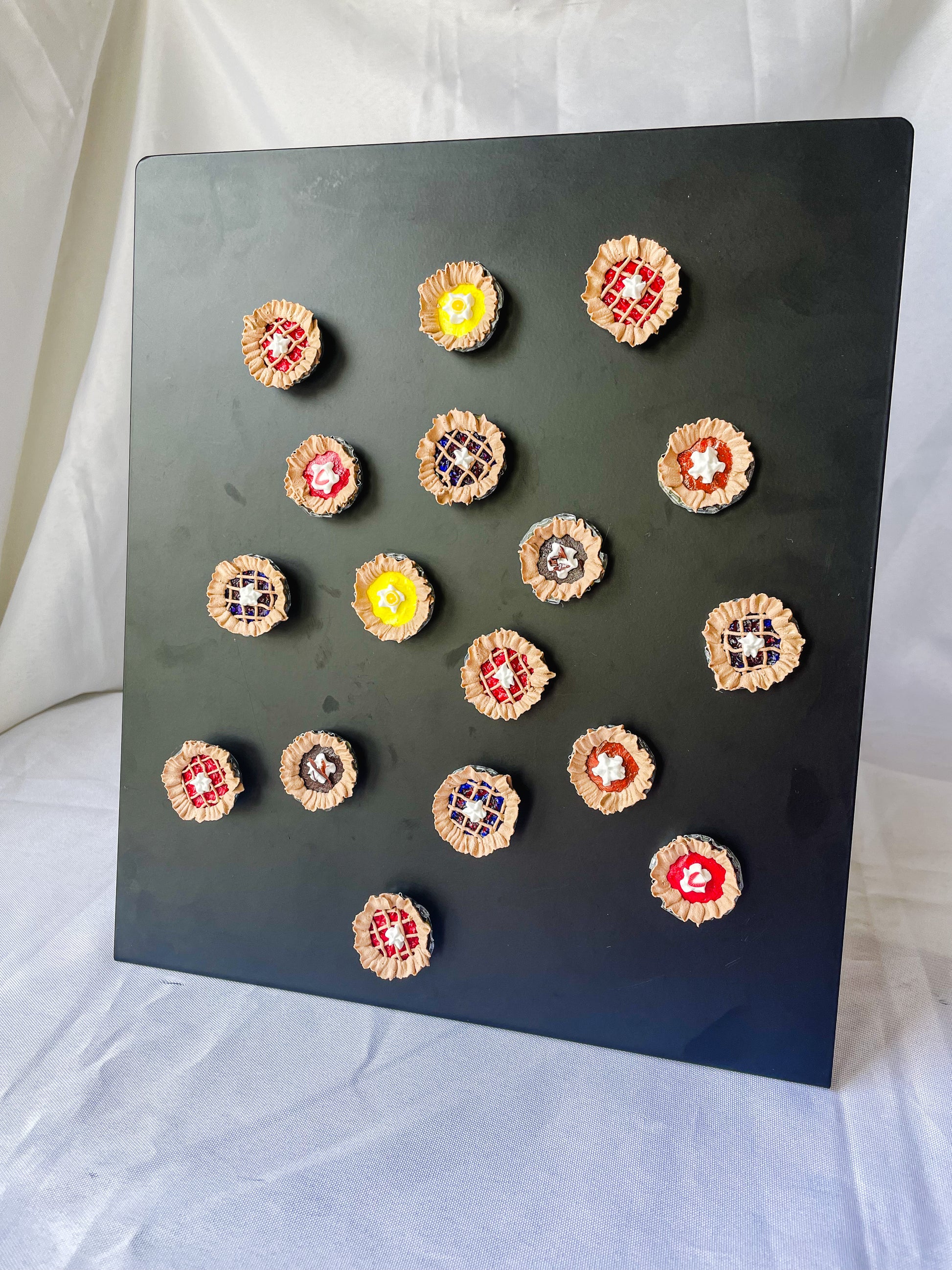 These upcycled bottle cap pie fridge magnets are handcrafted from repurposed bottle caps, designed to resemble miniature pies with intricate details. Perfect for adding a touch of charm and sustainability to your kitchen decor, they securely hold notes or photos on any magnetic surface.