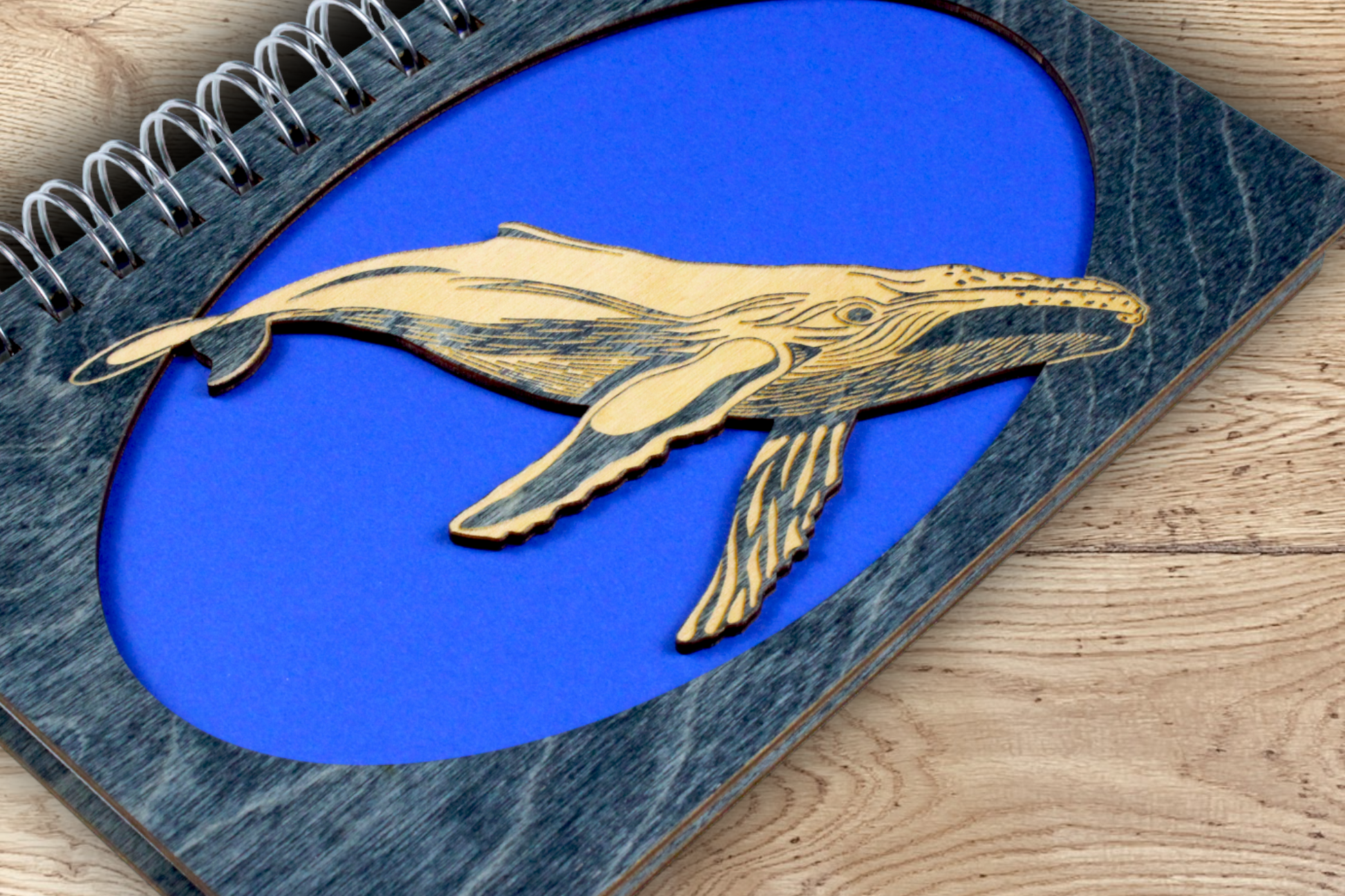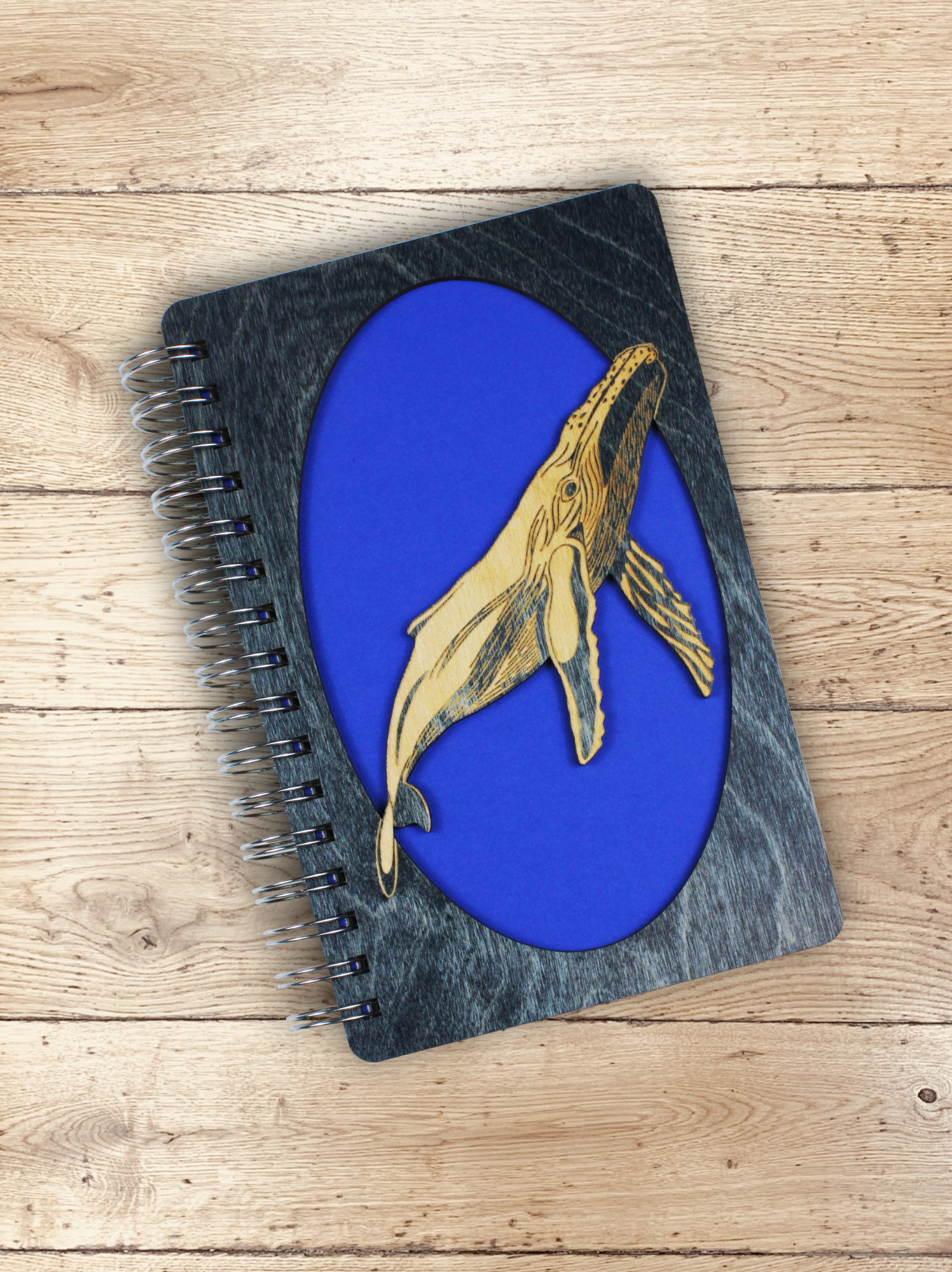 A Humpback Whale is featured on this journal/sketchbook. The front and back covers are made from Baltic Birch plywood stained with Blue stain and sealed with a water-based sealer and a blue color page can be seen through the cut out parts.