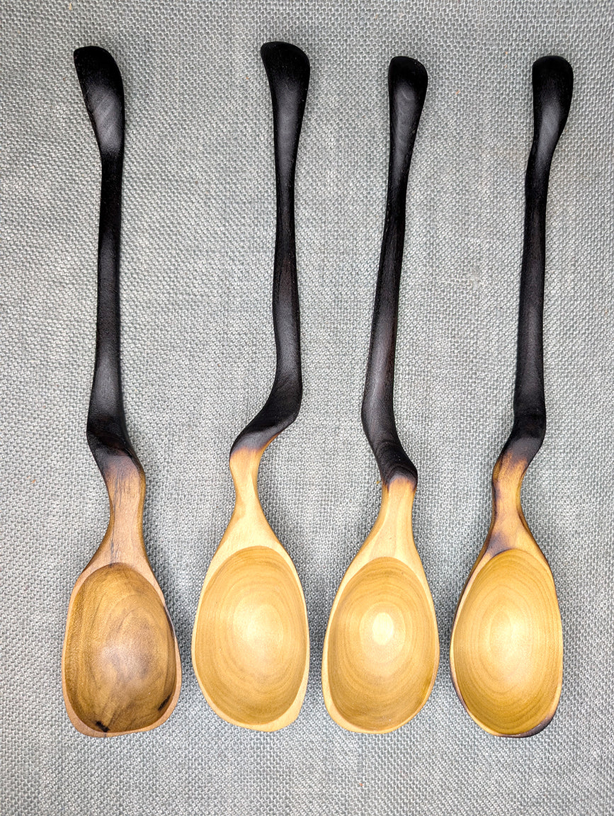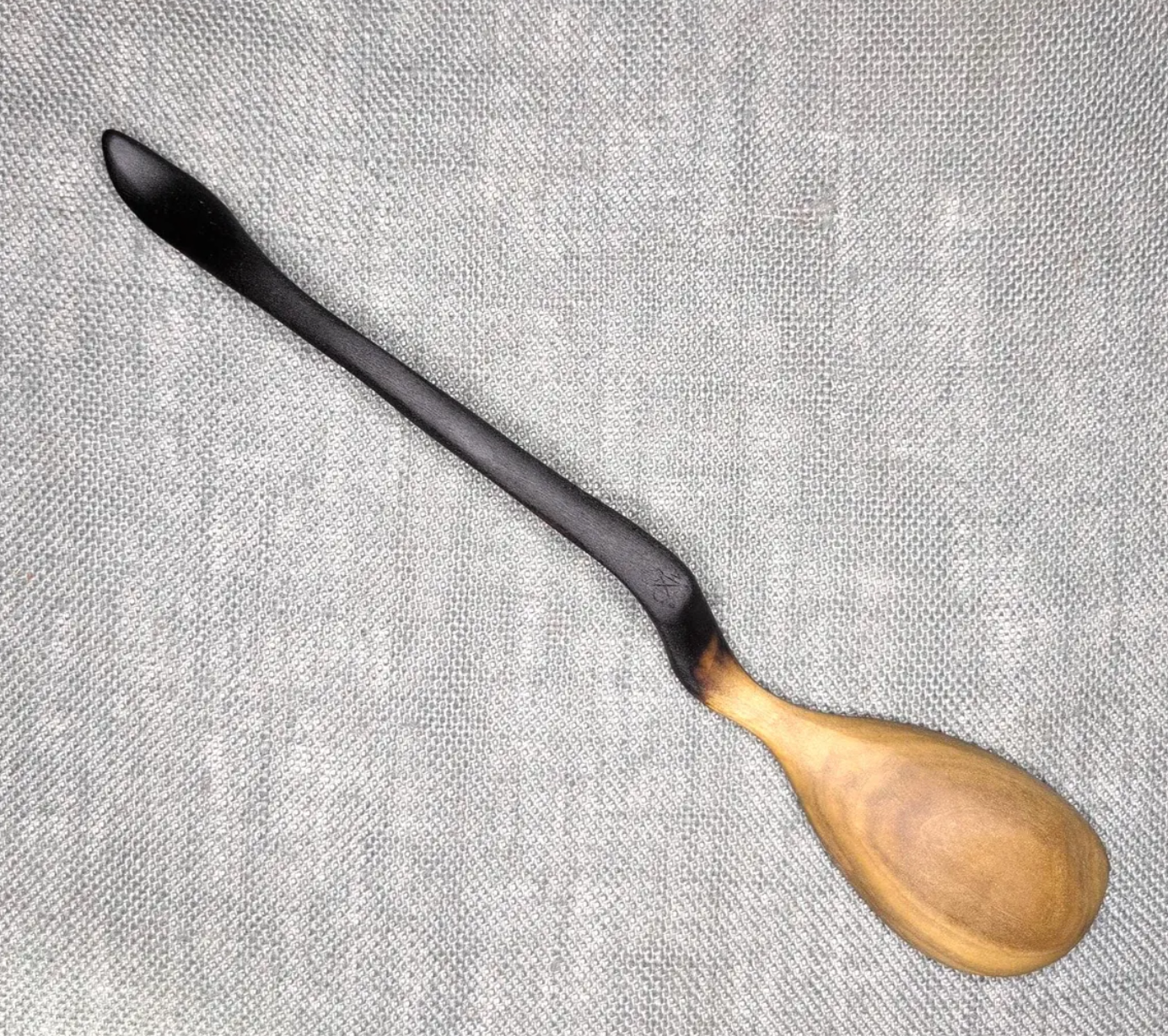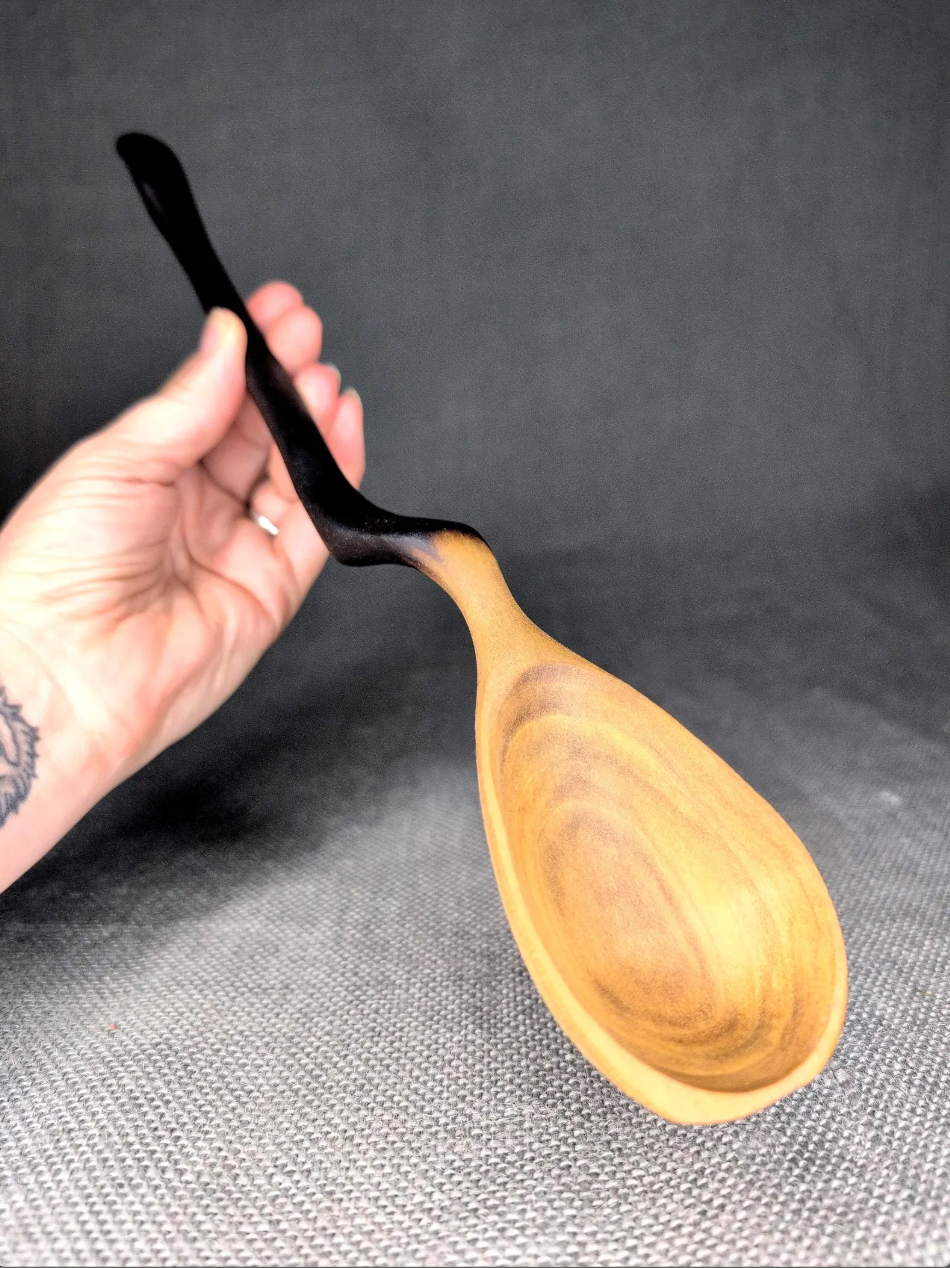 Handmade wooden spoon for cooking soups or kitchen decor. Hand carved out of sustainable Poplar wood with dramatic shou sugi ban burnt handle.