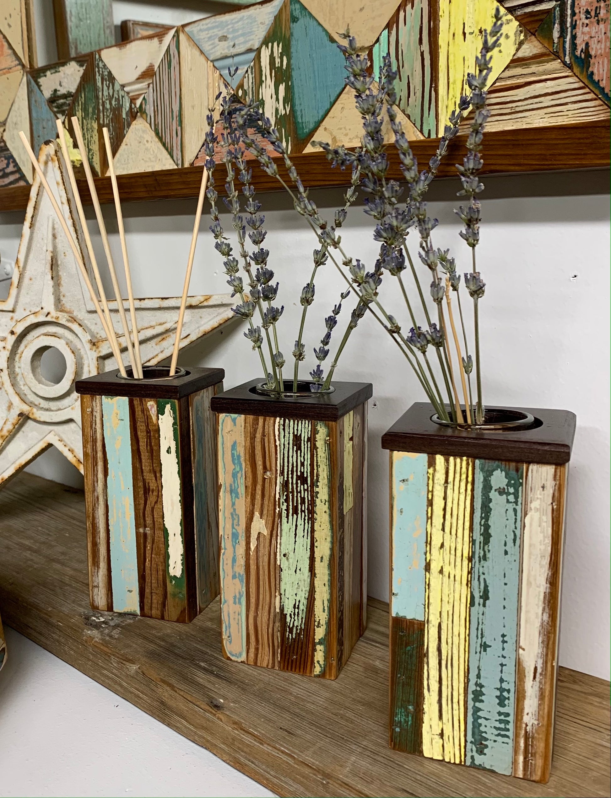 Multi-colored vase with vertical stripes created from reclaimed lumber salvaged in Louisiana. Able to hang on wall or can be freestanding. Includes glass insert.